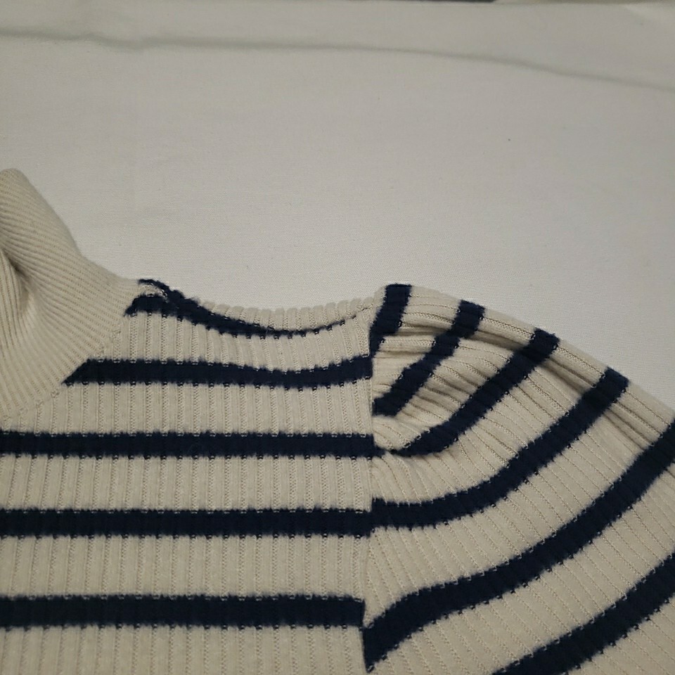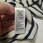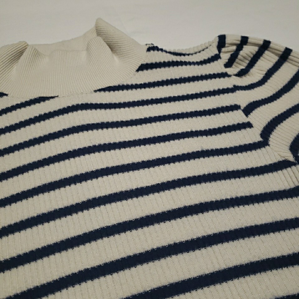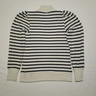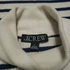 This is a J.CREW women's sweater in size S with a navy and white striped pattern, featuring a mock turtleneck and long sleeves with cuffed ends. Made of polyester, viscose and elastane, this knit pullover has a nautical theme and is lightweight, stretchy, and suitable for all seasons. It is machine washable and ideal for travel, casual wear, or work attire. Great Condition.