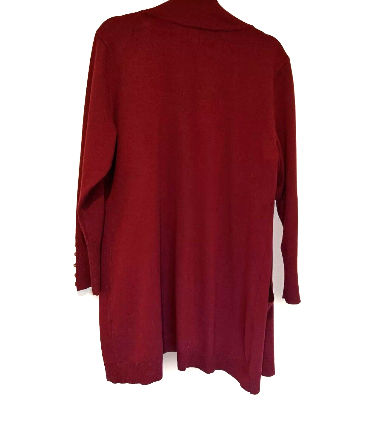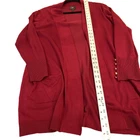 JM Collection Women XL Red Open Front Long Cardigan Pockets Career Professional This JM Collection cardigan is a stylish and versatile piece perfect for various occasions, such as travel, work, or casual outings. The cardigan features a solid red color in a tight-knit fabric with a long sleeve and open neckline. It has a professional and timeless design with raglan sleeves and button accents on the cuffs. The cardigan is lightweight and has pockets, making it practical and functional for everyday wear. Made of 78% Rayon and 22% Polyester, this cardigan is machine washable and suitable for all seasons. Classic, Designer, Timeless, Career, Professional, Workwear, Casual