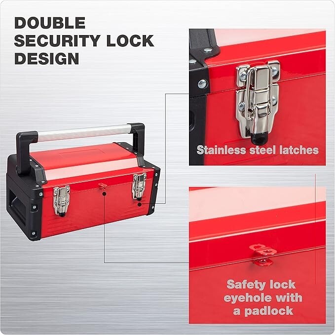 [Measurement and Application]Toolbox outer dimension is 16.14"*8.46"*7.09".Weight:5 LB.Perfect sized storage container.Tool organizer for home、craftsman、garage and car trunk.A small portable tool box for daily demands to help you tackle the toughest jobs [Durable and Structural Design]Tool box organizer is made of high quality steel&hard plastic and aluminum.Make sure steel tool box is sturdy and durable.A removable inner tray with handle divided 4 toolbox compartment can hold our most used tools-screwdrivers,pliers,wrenches,etc.The Roomy bottom compartment can store larger tools [Portable and Protective Toolbox]Long alum alloy handle with stripes increase friction to avoid hand slippage.4 corners of steel tool box are plastic wrapped for protection in case of impact.Toolbox both sides have recessed sections for hand-carrying [Double Security Lock]Lockable tool storage box comes with 2 stainless steel latches.For safety and reliability.More rigorous than the general toolbox, not easy to be accidentally opened [No-Risk Purchasing]Our products are subjected to rigorous testing.If you have any questions, please feel free to contact us.We accept return for no reason.We provide a limited 1-year manufacturer warranty