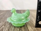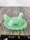This charming vintage jadeite green glass hen on nest salt cellar is a must-have for collectors and farmhouse decor lovers alike. The beautifully molded hen rests atop a wide ruffled rim basket, creating a timeless and functional piece. Whether used as a salt cellar, trinket dish, or simply displayed as a collectible, this stunning jadeite glass piece brings a nostalgic touch to any kitchen or dining setting. The soft green color enhances its vintage appeal, making it an eye-catching addition to your collection. **No chips or cracks. Perfect condition. Additional photos are available upon request. **This Hen on Basket is about 3" wide and 2.25" tall.