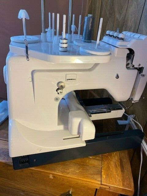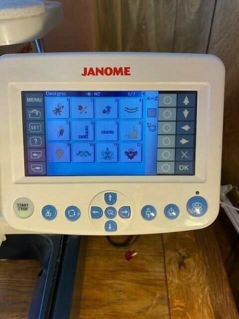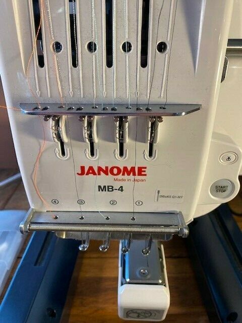 Janome MB-4 Four Needle Embroidery Machine The Janome MB-4 is the "World's First" home-use four-needle embroidery machine! Everything you love about Janome embroidery with four times the capacity! And so easy! Just set up your embroidery and move on to other projects while the MB-4 gets it done. The MB-4 works with most embroidery formats, including those used by industry professionals. It can use six industry-standard Tajima hoops, as well as the four available Janome hoops to further expand your creative opportunities. This also comes with Hoop Tech hoops and Magna Hoops, You will have a hat hoop and 14 other sizes of hoops with brackets. I use the pink hoop tech hoops, I just bought those last year for $600.00. You also get Digitizer Jr, Software 4.0, You will get embroidery thread sent also to help you get started. You can wind your own bobbins with this machine, but you will need to purchase a shuttle for the MB4 and leave the piece inside the bobbin case, I use magnetic bobbins and they work great. You will also get a big spool of white bobbin thread if you want to fill your own, This machine is so easy to learn, I have enjoyed it. Contact me for more photos and any questions Features Backlit LCD screen. Auto thread cutter. USB memory key compatible ATA PC card port and USB port (Host) on RCS; USB port on MB-4 Compatible with Janome software Embroidery speed up to 800spm Built-in features: Built-in Designs: 50 Fonts: 10 Monogramming: 2 & 3 letter Expanded built-in memory Change colors to favorite thread: Janome, Robison-Anton, Madeira Drag & Drop editing for easy placement Embroidery design resize 80% - 120% by 1% Rotate in 1 and 90 degree increments (clockwise / counter clockwise) Flip vertically and horizontally Standard hoops: M1: 9.46" x 7.88" (240mm x 200mm) M2: 5" x 4.3" (126mm x 110mm) M3: 50mm x 50mm Embroidery area tracing My SET screen controls for contrast, in/cm, designation and other customization Zoom in and out Multi-language selection Stitch-out time indicator Stitch Counter Upper thread and presser foot sensors Manual thread tension control Ball bearing precision Accessories included with this offer. This will differ from what comes with a new machine. Bobbins Needles Embroidery Hoop M1 9.46" x 7.88" Embroidery Hoop M2 5" x 4.3" Embroidery Hoop M3 2" x 2" Power Supply Cable Copy of Instruction Book
