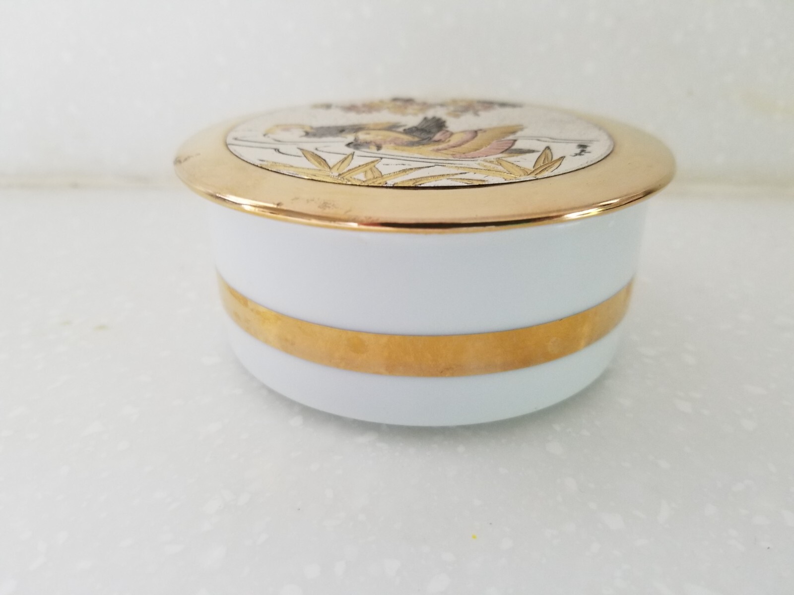 4" inch round collector trinket box with a white porcelain base featuring a decorative design of birds in the Japanese art of Chokin style. It is made in Japan and has intricate 24 Kt gold trim details. A beautiful piece of decorative collectible showcasing Japanese culture and craftsmanship. Very good preowned condition with no chips or cracks. Please view photos.