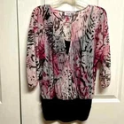 Elevate your wardrobe with this stunning Jennifer Lopez blouse featuring a unique pink and black abstract print. The blouse has a V-neckline and 3/4 dolman sleeves, making it perfect for any occasion, whether it's a casual day out or a fancy party. The lightweight, stretchy material with a shearling fabric type ensures a comfortable fit, while the collarless design and pullover closure add a touch of convenience. This blouse is perfect for the summer, fall, or spring seasons and can be easily paired with any bottom, whether it's jeans, a skirt, or shorts. The blouse is hand wash only and comes in size S. With its hipster, designer, and colorful theme, this blouse is a must-have for any fashion-forward woman. Very good pre owned condition mesh Shell 100% sheer polyester jersey Shell 95% polyester 5% spandex lining 95% polyester 5% spandex 16’ across chest inside top 16.50’ across bottom band side gathers 27’ long from collar seam to bottom front elastic around end of sleeve
