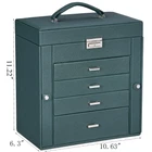LARGE CAPACITY JEWELRY BOX:5-tier and 2-wings can organize all your jewelry. The top layer with lock and mirror to valuable jewellery. Contains 4 pillows, 4 earring grids and 7 ring cushions, 12 equal-sized squares, large sunglasses grid. The middle 3 layers can be interchanged MULTI-FUNCTIONAL JEWELRY ORGANIZER:The jewelry box It can be put a couple watches, earrings, rings, necklaces, hairpins,brooches, bracelets, and some sunglasses distributed into all the drawers. Avoid jewelry tangle and loss and tarnish in the air, keep your desktop neat and clean STURDY and ELEGANT for WOMEN:The jewelry box frame is made of medium density fiberboard, the structure is stable and will not dent or fall apart. The exterior is Faux Leather, which can be cleaned with a damp cloth without cracks or peeling. The interior soft velvet lining can protect your jewelry from scratches.Elegant and suitable for women of all ages JEWELRY ORGANIZER BOX with LOCK and MIRROR: Intimate and convenient. You can save your precious jewelry box in the lockable grid to prevent loss and trouble. The mirror on the top layer is convenient for you to choose the right jewelry to match your makeup, and find the objects you want more quickly GIFTABLE-BEAUTIFULLY CRAFTED:The jewelry box exquisite workmanship and exquisite hardware. For GF, MOM and daughter, it is a good choice for Valentine's Day, Mother's Day, birthday or Christmas SMALL FOOTPRINT: 10.67" L x 11.30" H x 6.22 W, It can be placed on your dressing table or vanity, it will not take up a ton of space
