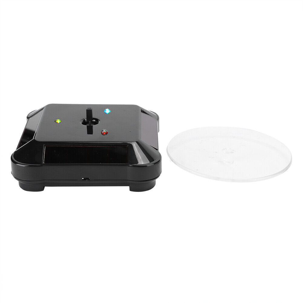 Feature: 1. Small in size and light in weight, easy to assemble after removing the plate cover. 2. Solar racks are environmentally friendly and can work under light. You can use them to display products in window, shelves, counters, layering shelves or floors. 3. The four‑sided solar panel ensures maximum light reception to power the turntable. 4. Applicable to jewelry, mobile phones, watches, crystal ornaments, cigarette, cakes, etc. 5. Fluorescent light, solar light, solar or battery power supply, widely applications. Specification: Condition: Brand New Item Type: Rotating Display Stand Material: Plastic Color: Black Description: With LED light switch: You can turn items on/off with one light switch No battery on/off switch: The solar energy can drive the display to rotates through the four built-in solar panels, so there is no on/off button on the upper part of the battery rotational base to stop the rotation. The way to control the stop of rotation is to remove the panel or battery Heat Resisting Temperature: 80℃ Cold Resistant Temperature: -10℃ Load Bearing: 300 - 500 g / 10.58 - 17.64 oz(approx.) Two Styles / Types of Stands: With / Without lights Dual Use: Solar energy or batteries; Solar cell Power Supply: Fluorescent light, solar light, solar or battery power supply Battery: 1pc AA Battery (Not included) Scope of Application: Applicable to jewelry, mobile phones, watches, crystal ornaments, cigarette, cakes, all kinds of small gifts, jewelry sales display, display in the store, window, office, counter, display cabinets and other public places for advertising purposes Note: 1. Flash: If the beaded style is selected at the upper part of the display base, you will need to install the flash when using the battery. 2. If the flash is not used, try unplugging the battery to reduce power consumption in bright light. 3. The on/off switch is used for lighting. It does not have an on/off switch for batteries. 4. The lighting shed with higher strength rotates faster and have strong load capacity, and , with slower and weaker speed, which can also be improved by using batteries 5. The solar display panel in a quiet place will make some noise Display Stand Size: Approx. 9.5 x 9.5 x 4cm / 3.7 x 3.7 x 1.6in Tray Diameter Size: Approx. 9cm / 3.5in Package List: 1 x Display Stand 1 x Tray