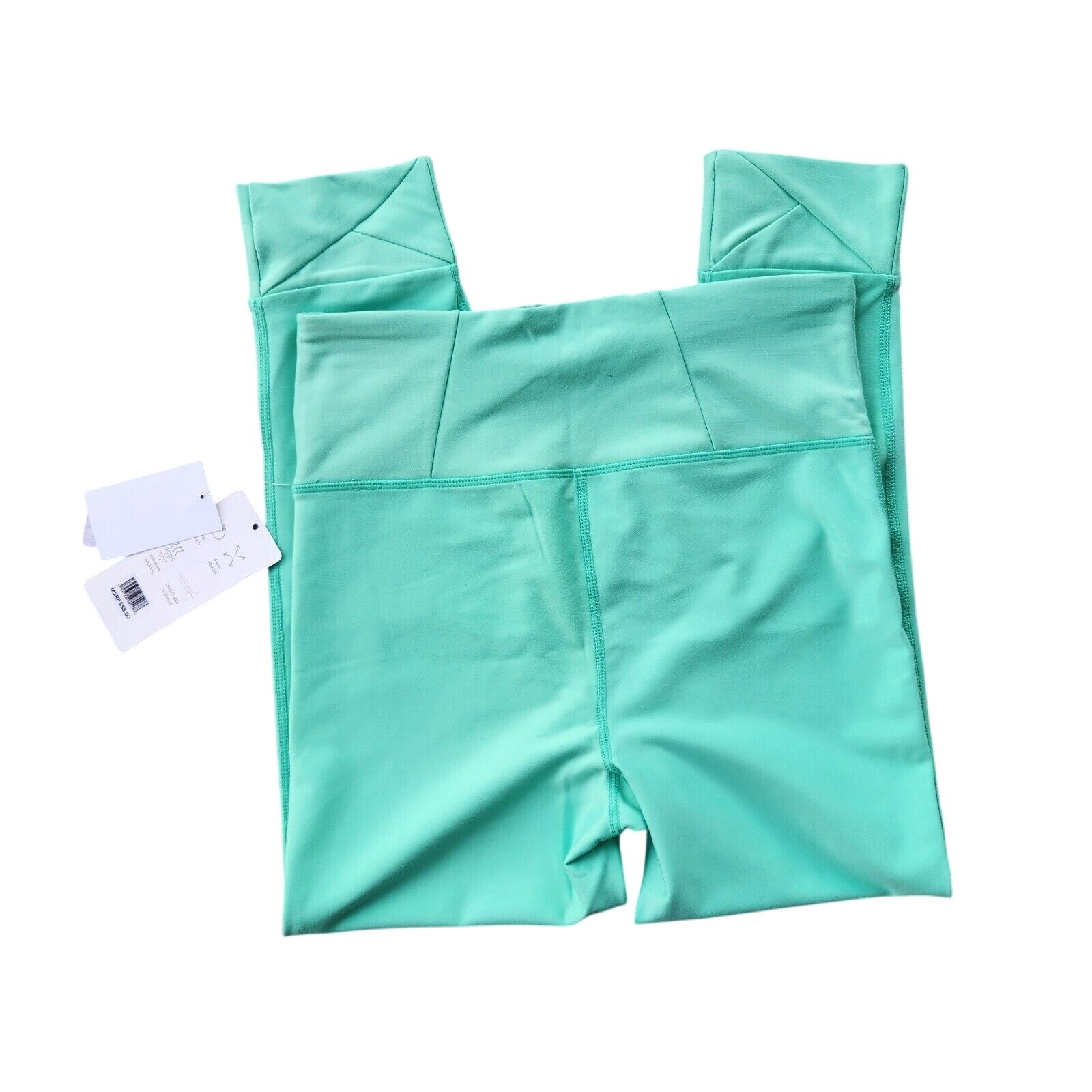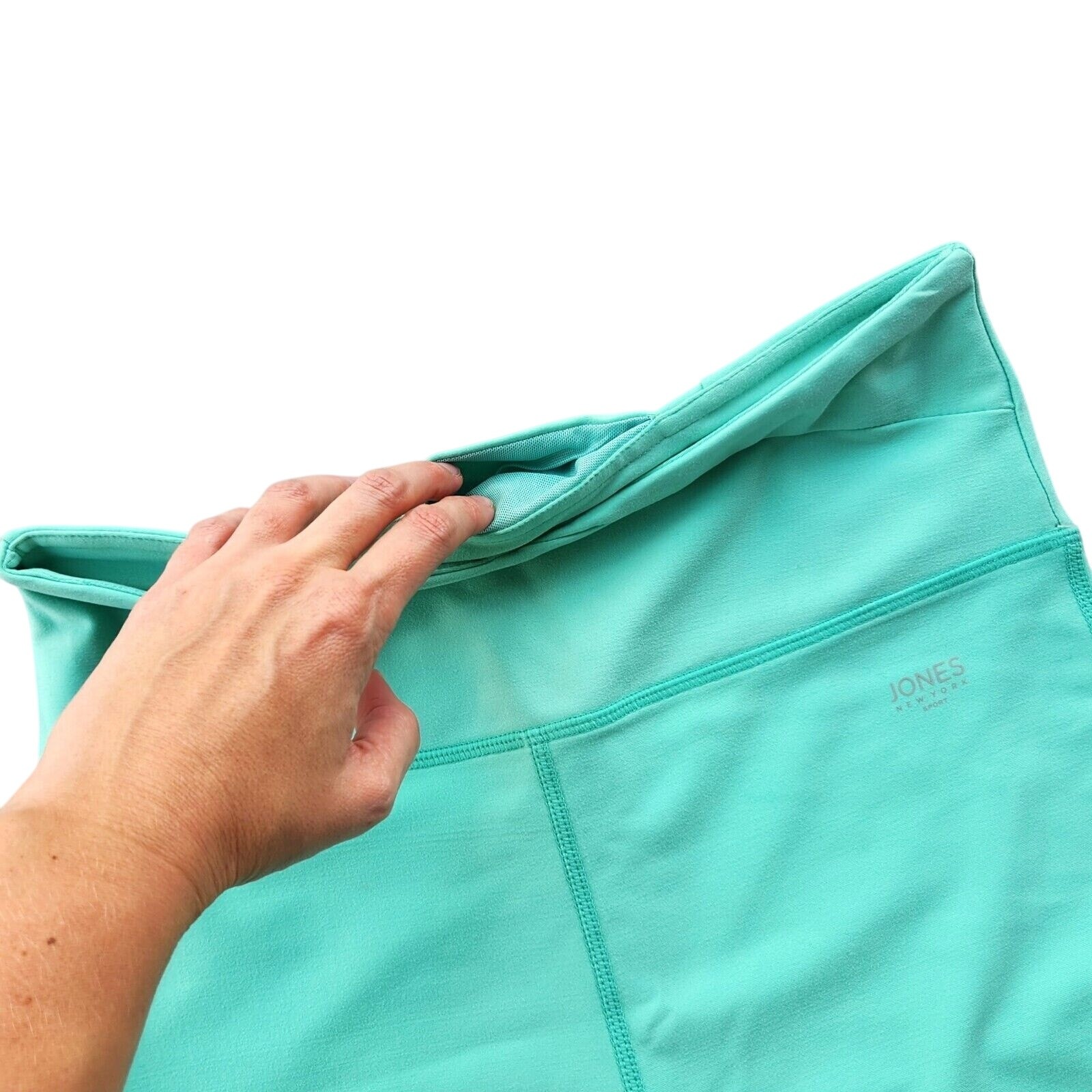 Jones New York Women Aquamarine Workout Sports Yoga 7/8 Crop Leggings Size S New with tags Perfect for the gym, yoga, running or paired with your favorite oversize top Hight waist Contrast bottom hem Hided back pocket Thick compressive fabric 7/8 length Inseam 24"