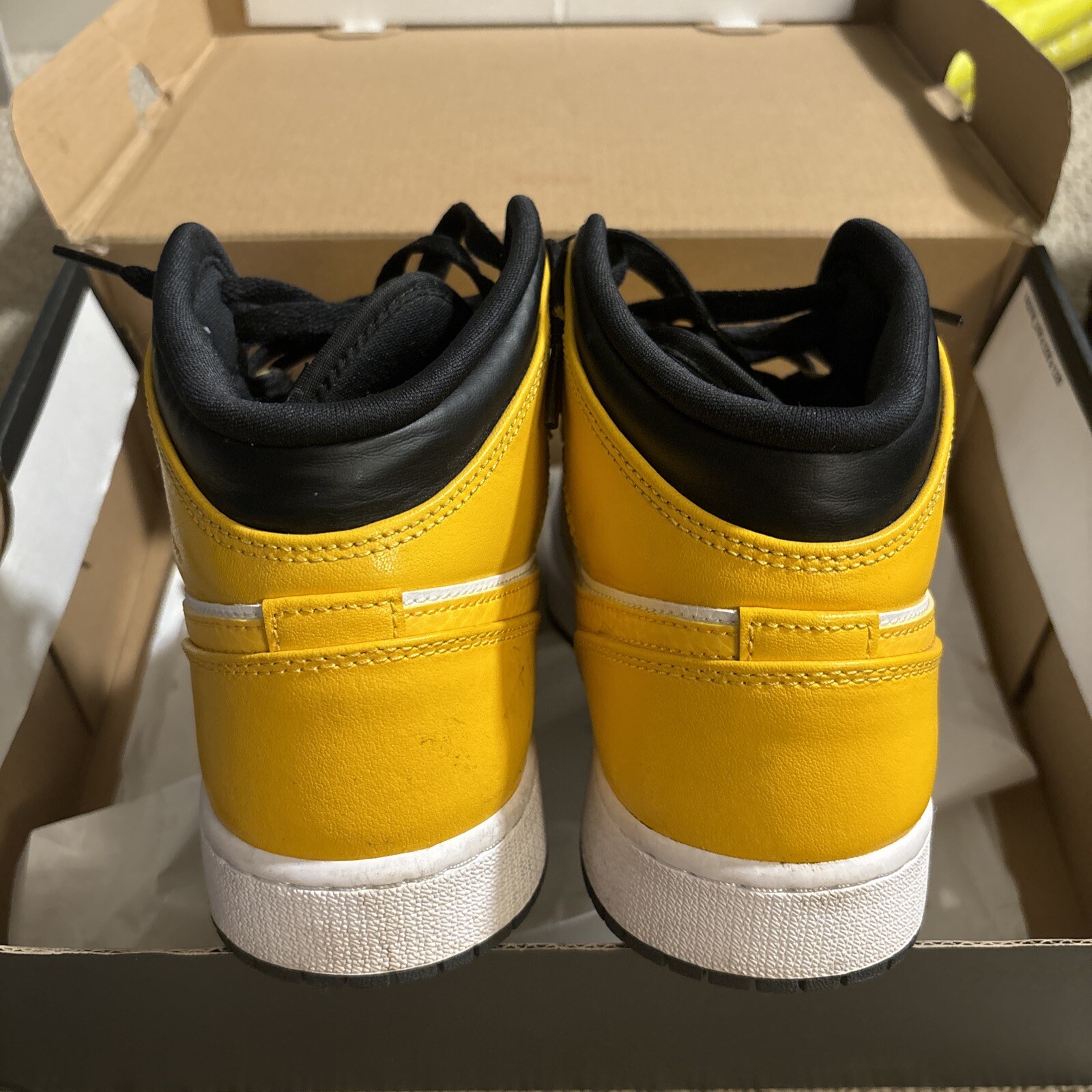Jordan 1 Mid Yellow sneakers. Designed with a mid-top silhouette, these shoes are perfect for any casual or athletic occasion. The iconic Air Jordan product line ensures high-quality materials and construction, while the retro theme adds a touch of nostalgia to your outfit. Featuring a standard shoe width and size 8.5, these sneakers are made for men or women who appreciate both comfort and style. The vibrant yellow color and Michael character add a unique touch to these shoes, making them a must-have for any sneakerhead. Don't miss out on the opportunity to add these Jordan 1 Mid sneakers to your collection.