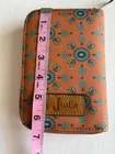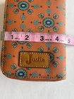 The Justin Boots Travel Jewelry Case is a stylish and functional accessory . Made of vinyl, this rectangular jewelry organizer features a vibrant orange color with blue flowers and horseshoes, adding a touch of Western flair. With a zip-around design, this case is perfect for storing necklaces, rings, and earrings while on the go. Made by the well-known brand Justin Boots, this travel jewelry case is both practical and fashionable for any woman looking to organize her accessories in style. Brand new, never used, no flaws Measurements: 4.75 x 6.5 x 0.75 inches Leather logo, black suede inside with leather straps to hold jewelry