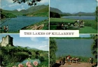 MAKE AN OFFER. THE MORE YOU BUY THE BETTER DEAL I WILL ACCEPT The postcard features a picturesque view of the Lakes of Killarney in Ireland. The lakes are located in a valley surrounded by the highest mountain range in Ireland. The area is known for its stunning beauty, with woodlands blending into the blue waters of the lakes.