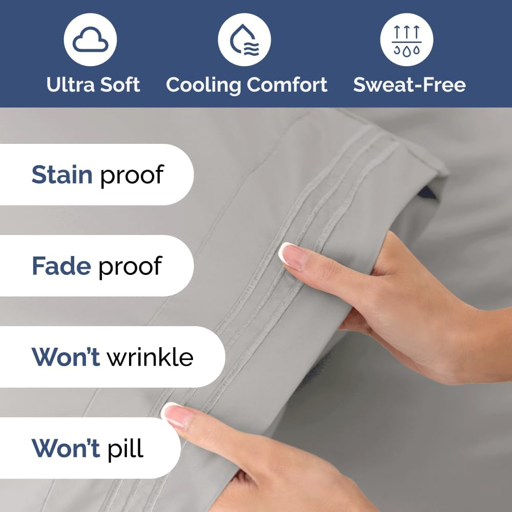 EXTRA DEEP POCKET KING SHEETS / EXTRA DEEP FITTED KING SHEETS: These bed sheets are for very deep pocket mattresses. They fit any mattress with pockets that are 18, 20, 21, 22 and 24 inches deep. There's stretchable elastic around the extra deep fitted sheet which stretches for a nice tug around your mattress. Perfect for extra tall & large mattresses. Rest assured these oversized sheets will stay on tight & stay in place! 6 PIECE SHEET SET: This bed sheet set comes with 4 pillowcases total all with a beautiful decorative embroidery design on each pillow case. The pillow cases have enclosure designs. This bedding set will accommodate your extra thick mattress perfectly. GREAT FOR DOUBLE PILLOW TOP MATTRESS: These bed sheets are perfect for mattresses with a 3 inch or 4 inch topper on top, memory foam toppers, big mattress pads, pillow tops, foam toppers, big foam toppers, pillow top mattresses and memory foam. These sheets will not come off. MICROFIBER: These are the softest type of microfiber bed sheets we have created. Super soft with a light feel. Not crisp like cotton. If you're accustomed to cotton sheets and you've never tried microfiber sheets we recommend you give these a try. They're even softer than cotton! DIMENSIONS & SIZES: Flat Sheet 111 wide and 102 long. Fitted sheet 78 wide and 80 long with 21 inch pockets (has elastic so it can stretch). All four pillow cases are oversized 20 x 40 inch. Product Description The video showcases the product in use. The video guides you through product setup. The video compares multiple products. The video shows the product being unpacked. Shop the CGK Linens catalog of luxury bedding products Add to Cart Add to Cart Add to Cart Add to Cart Customer Reviews 4.4 out of 5 stars 83,271 4.6 out of 5 stars 45,104 4.3 out of 5 stars 3,117 4.7 out of 5 stars 36 Price $59.99 $ 59 . 99 $13.99 $ 13 . 99 $49.99 $ 49 . 99 $192.00 $ 192 . 00 Fits Sizes 18 to 24 Inch Mattress 30" Length x 19" Height Twin, Full, Queen, King 18 to 24 Inch Mattress Triple Embroidered Pillowcases Triple Embroidered Triple Embroidered X Triple Embroidered Envelope Enclosure Pillowcases Envelope Enclosure Envelope Enclosure X Envelope Enclosure OEKO-TEX Certified Yes Yes Yes Yes Product Care Machine Wash Machine Wash Machine Wash Machine Wash Wrinkle Proof Yes Yes Yes Yes Fade Proof Yes Yes Yes Yes Stain Proof Yes Yes Yes Yes