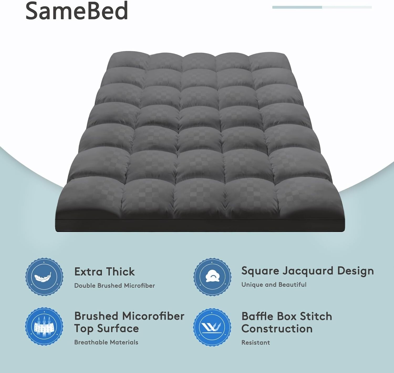 Mattress Topper King,Extra Thick Mattress Pad Cover for Back Pain,Cooling Mattress Protector with 8-21 Inch Deep Pocket,Overfilled Down Alternative Filling,Grey Premium Surface Material - The mattress topper adopted microfiber fabric made, which is breathable and skin-friendly, providing you superior softness and comfort. The surface features square jacquard design, both beautiful and unique. And the mattress pad is made of 400TC combed fiber, is durable, less likely to tear even with frequent washing Box Quilted & Filling - Our mattress topper double filled with 5D & 7D snow down alternative filling, extreme soft, fluffy and warm. Unique box quilted design, which allows the padding to be fixed in each box, does not shift easily Deep Pocket - Stretchable knitted skirt, 360° all-around wrapping design, high elastic pocket protects the mattress in all directions, you can toss and turn randomly during the sleepy nights. The extended bed skirt design is suitable for 8-21" mattresses, with broad applicability to meet various needs Relieve Back Pain - The mattress pad provides you optimum thickness, achieves a smart balance between softness and cushioning. When you sleep on our mattress pad cover, it can gently cushions the pressure points on your back, lower back and hips to help relieve back pain, providing a ergonomic support and comfort for your sleep Machine Washable & Easy Care -Our mattress protector is easy to clean, the mattress cover can be cleaned in the washing machine at low temperature. Tumble dry on low. Please do not iron and do not dry clean. For optimum fluffiness, you can tumble dry it on low heat before use it Customer Service - Customer satisfaction is our top priority. We provide a 365-day satisfaction promise. If you are not satisfied with our products or have any questions, please let us know, We will do our best to give you the perfect solution. Choose an mattress topper as a present for yourself, family, or friends