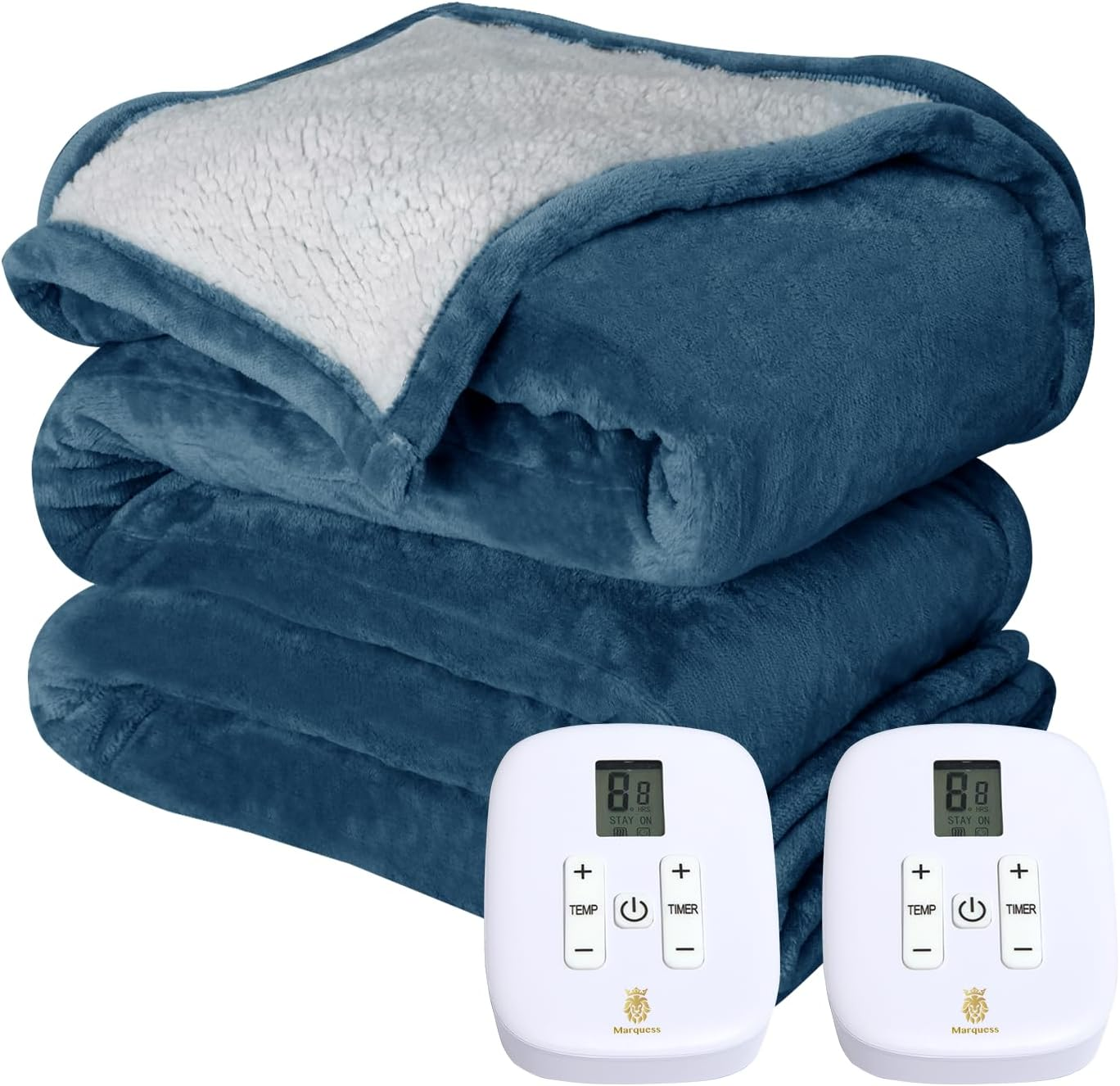 King Size Blanket( 84 inches×90 inches): Face 100% Microlight Plush, Reverse 100% Sherpa Berber. Suitable for Queen size bed. Thinner wires heat up faster and feel less stiff and bulky. One Blanket Two Temperature : Everyone's body feels different, and if your wife or husband feel hot or cold, our electric blanket is the perfect solution!The temperature of the left and right sides is adjusted separately! Our King size electric blanket dual controls allow you to sleep at your preferred temperature setting without sacrificing your partner's preferences. More Function Blanket: This King size blanket is designed with 10 heating levels and adjustable Auto Shut-off From 0.5 to 12 Hours. Voltage- 120V, Hertz- 60Hz, Watts- 100W. These king size heated blankets with long power cable (17.34 feet extension cord) make it convenient for you using our electric blanket to get warm in cold winter. Easy Care: Machine washing warm mild or delicate cycles and machine drying fewer than 40 in low heat. Don't dry cleaning or use bleach. Flannel fabric is easy care, warm, plush, and elegant. Double Safety Protection: Worried about high temperature risk and electric shock? Our blanket is 10 hours automatic power off to prevent fire and save energy. The heating wire is wrapped with high quality thermotolerant material. In addition, the switch uses double insurance, fuse and temperature control. All we do is for your safe use! Product Description The video showcases the product in use. The video guides you through product setup. The video compares multiple products. The video shows the product being unpacked. 1 Step 2 Color Size Cold winter has come. Let our electric blanket to guard your warmth! Electric blanket is not only the safest and most effective heating method, but also the more economical than other space heater. Our electric blanket is made from ultra soft flannel and cozy Sherpa, design with powerful functions to meet your different need. You can easily get warmth with just a few simple steps, and there are multiple colors and sizes for you to choose from. If you didn't choose this perfect electric blanket last winter, please don't miss it this winter! Fast Heating May you stay warm in winter. We have designed a quick heating function to help you resist the cold and reach a comfortable state in a very short time. Easy Care Disconnect the power cord& controller. Toss in the wash. Air dry or tumble. Dry on low heat. Extra Warm and Cozy The oversized size is made of silk flannel, and the interior is made of Sherpa velvet for optimal comfort, effectively keeping both sides warm. Exquisite controller Adjustable heating temperature and heating time, with memory and protection functions, convenient and safe. Marquess Heated Blanket Add to Cart Add to Cart Add to Cart Add to Cart Customer Reviews 4.3 out of 5 stars 2,165 4.3 out of 5 stars 2,165 4.3 out of 5 stars 2,165 4.3 out of 5 stars 2,165 Price $89.99 $ 89 . 99 $59.63 $ 59 . 63 $89.99 $ 89 . 99 $89.99 $ 89 . 99 machine-wash ✔ ✔ ✔ ✔ Size Twin Queen King Twin Queen Twin Queen King Twin Queen King Multi level adjustment ✔ ✔ ✔ ✔ Coloe Gray Green Navy Linen Brand Marquess Marquess Marquess Marquess
