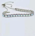 Made up of faceted aurora borealis stones that reflect flashes of rainbow colors, this bold and beautiful Bracelet can be worn casually by day or in a formal setting at night. From Kirks Folly. Plated Silver tone Aurora borealis faceted, polished finish Pull Closure or Expansion Measures approximately - One size should fit most Imported