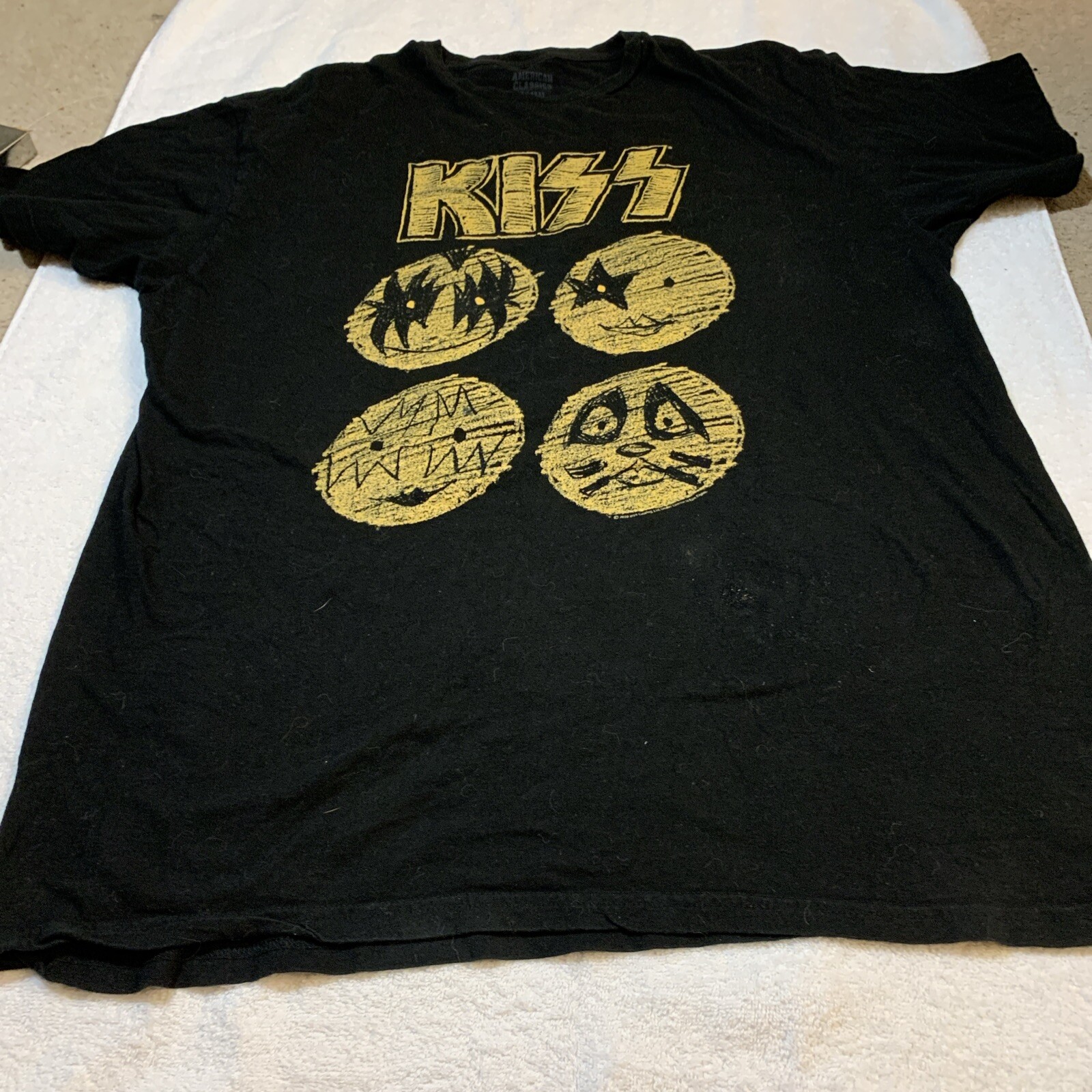 This American Classics T-Shirt in size XL is the perfect addition to any music lover's wardrobe. With a classic black color and crew neckline, this shirt is suitable for both men and women. Made from soft cotton material, it features a regular fit and short sleeves, making it comfortable to wear during any musical performance or casual outing. The shirt's design showcases the band's name, Kiss, in bold white letters, making it a great choice for fans of the iconic rock band. Whether you're a seasoned musician or just a fan of Kiss, this shirt is a must-have for any music enthusiast. Made in Haiti, this T-Shirt is a unique addition to your collection.