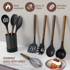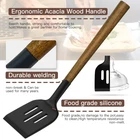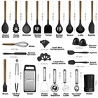 34 COOKING UTENSILS - Utensil Set includes everything you need to cook that perfect dish,includes Slotted Spatula ,Slotted Spoon,Flexible Spatula,Slotted Turner, Solid Turner, Pasta Server,Solid Spoon, Kitchen Tongs, Draining Spoon, Whisk ,Deep Soup Ladle,Spatulas,Brush,Peeler,Pizza Cutter,Potato,Pusher,Ice-cream spoon,Can opener,Grater,measuring cups and spoons set,Cheese knife,Spatula,Holder PROTECT YOUR EXPENSIVE PANS: The non-scratch silicone heads pair great with your expensive non-stick pans, pots and bakeware, ensuring that the cookware surface is not scratched or dented; they’re the perfect tools to extend the life of all your kitchen pans. HIGH TEMPERATURE WITHSTAND:The Silicone Cooking Utensils can withstand high temperatures up to 446°F/230°C. All-around silicone added to the softness, no longer worry food will stick your cookware.They are scratch resistant, unlike plastic and rubber utensils that will easily melt or metal kitchen utensils harm your nonstick pots HIGH QUALITY NATURAL Acacia WOODEN HANDLE: Each spatulas with durable hardwood, which is durable than ordinary wooden handle can last up to 40 years under the proper care. ATTENTION: because of the natural acacia wooden handle, Please do not soak in water for a long timeand or use the dishwasher, Do not use a sharp dishwashing brush to clean the wooden handle. It is recommended to hand clean the wooden handle with clean water or wipe it with a soft cloth. It needs to be dried before storage CUSTOMER SATISFACTION GUARANTEE - We are committed to providing each customer with the highest standard of customer service. If you have any problem about the utensils set, please feel free to contact our customer service, we're always here for you
