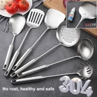 High Quality All Metal Cooking Utensils Set: Made of food-grade heavy duty 304 stainless steel, forged in 1-piece, sturdy and anti-rust. Very clean lines, good weight and balance, comfortable grip, ergonomic design. Great Choice for Presents: 1 wok spatula, 1 ladle, 1 skimmer, 1 slotted spatula, 1 spaghetti spoon, 1 large spoon. Plenty of tools for all needs, easily meet challenges of any menu or dish, great presents for a cooking enthusiast. Easy To Use and Store: The handles are round but hollow, so they're not so heavy, helps to eliminate stress on the arms, the handles are temp proof so they won't burn your hand. With big hanging holes, easy to be hung to save space. Easy To Clean: Forged in 1-piece, prevents dirt and grime from hiding, easier to clean. Hand wash or dishwasher safe. Compared to silicone or wood material, healthier and more sturdy, and also wouldn't affect the taste of food. Professional Kitchen Utensils Set Stainless Steel: A complete complement to carbon steel, cast iron woks, great for home use and commercial use, restaurant, hotel, picnic etc.
