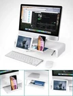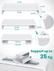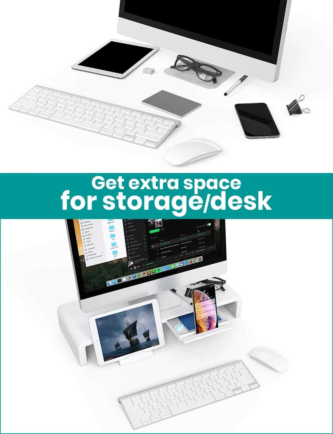Monitor Stand Riser, Klearlook Maximized Clarity Foldable Computer Monitor Stand, Adjustable Computer Stand Desk Organizer with Storage Drawer, Tablet Phone Stand for Laptop PC Printer (White) About this item ✅ 3 Width Adjustable Monitor Stand: This computer stand is adjustable with 3 kinds of width-16.5 inch, 18.5 inch and 20.5 inch. you can adjust it's width as you want, suitable for different monitors, and when you want to elevate the monitor height. ✅ Ergonomic Design: Keep your monitor at comfortable eye level to effectively prevent your back and neck strain when you work in front of a computer. And simply pushing your keyboard under the stand to save more space. ✅ Sturdy & Stable: This monitor stand is made of ABS platform and metal hinge, it can easily hold up to 55 lbs monitors, laptop, printers etc. without wobbling and the surface will not sag within its weight capacity. ✅ Smart Desk Organizer: Built-in 1 phone or tablet holder, 1 pen holder and 1 small storage drawer for convenient storage, come in hand when you need to immediately use your phone, tablet and pen. Just enjoy a tidy workstation! ✅ Widely Application: Not only can be used as a monitor stand, it can also work as a printer stand, computer stand, laptop stand, TV stand or even a desk shelf.