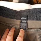 Has stains shown in photo 3 and 4. Tagged size 36x32 see photos for measurements to determine proper fit before buying. Thanks. Olive greenish gray color.