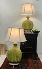 2 Uttermost ceramic lamps with weighted bases. The whimsical style works well with mid-century, bohemian, or maximalist decor. The unique profile of these lamps gives them the visual mass to make a decorative statement, while not filling up an entire side-table with their bulk. Height to the base of the bulb is approximately 24 inches. Each lamp has a three-way switch. These lamps are excellent for mood lighting as well as reading. Lamps are sold as a pair with shades and will ship in two boxes. Lamp are heavy and safe packing means an oversized box. Lamps can be picked up in Halifax, VA. The lamp body is 13 in wide and 4 1/2 to 5 in deep. It is ribbed avocado green glazed ceramic with distressed dark brown accents. The base is weighted it is antique gold colored to match the neck and finial. Oval lined shades are covered in course linen-look material.