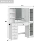 Makeup Vanity with LED Mirror & 2 Cabinet, 6 Drawers Vanity Desk with Power Outlet, 3 Color Modes, Brightness Ajustable, Glass Top and Storage Box, Dressing Table with Chair for Bedroom Product Description About this item Smart LED Lighting : Get studio-quality illumination with touch-sensitive controls. Choose from 3 lighting modes (cold light/natural light/warm light) and adjust brightness, 120 high-efficiency LED beads deliver perfect, shadow-free illumination for makeup and styling Massive Storage & Sleek Organization: Never clutter your space again! 6 large makeup sliding drawers , 2 open shelves and 2 lighted storage cabinets make your makeup environment well-organized, there are adjustable shelves inside the cabinets, you can adjust according to your needs. This vanity can hold all your cosmetics perfectly! Keeping everything visible and within reach Built-in Power Station: This vanity desk comes with a hair dryer stand and charging station. Including 2 AC outlets and 2 USB ports, so you can easily charge your phone, tablet, or plug in styling tools like hair dryers and curling irons, no more messy cords! Elegant Gift-Ready Design: Designed with a luxurious finish and modern aesthetic, this makeup vanity makes the perfect gift for birthdays, weddings, or Mother’s Day. Impress your girlfriend, wife, mom, or daughter with a stylish and functional beauty station Comfortable Vanity Stool Included: Relax in the plush padded stool, designed for extended makeup sessions. Its ergonomic height fits perfectly under the desk, saving space while providing maximum comfort Easy Assembly & Hassle-Free Support: All parts, tools, and step-by-step instructions are included for quick setup. If you have any questions, simply click "Contact Seller"—we’re here to help, ensuring a smooth experience! Glass Cabinet Come with Charging Station Storage Box Vanity Stool