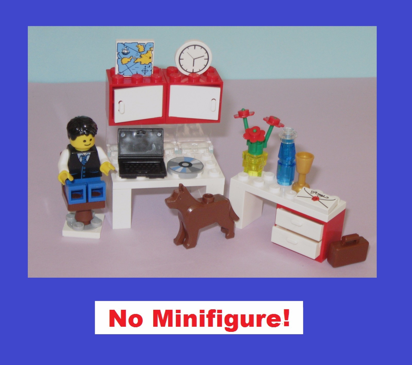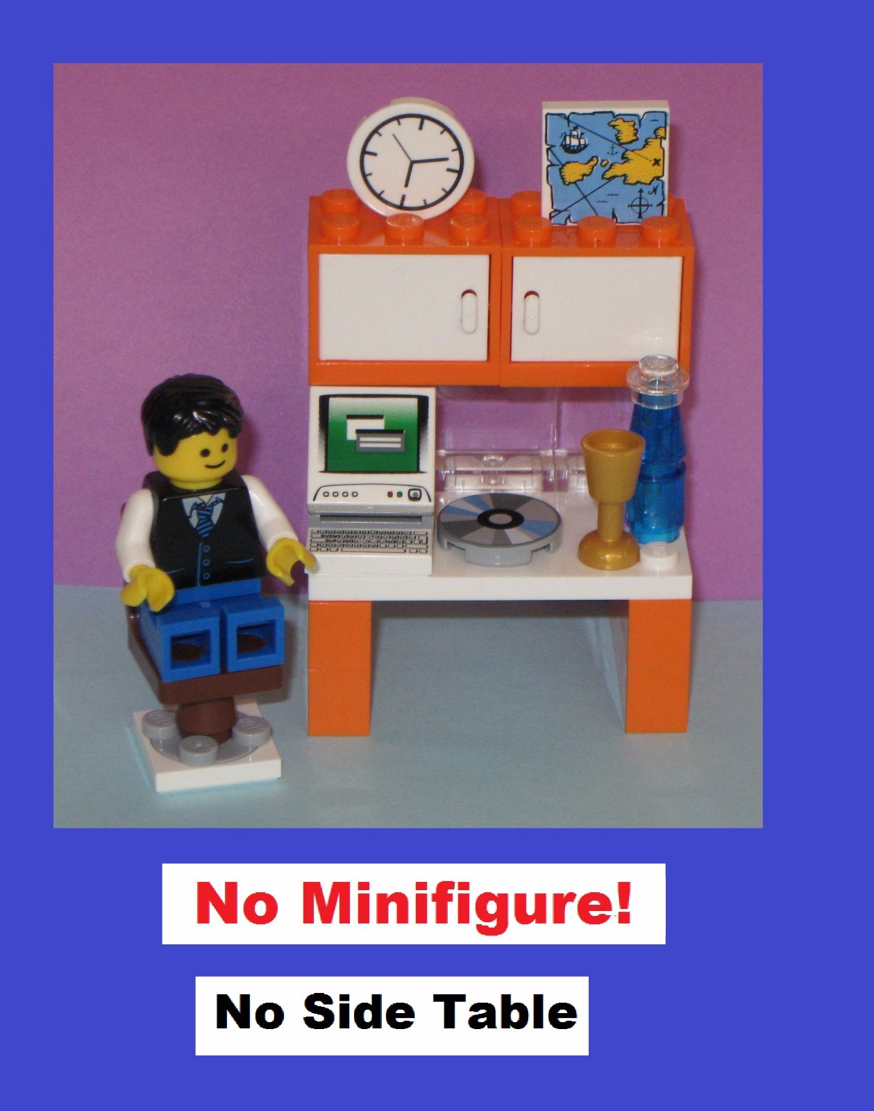 ********** MOC - My Own Creation MADE WITH ALL NEW LEGO BRICKS. ********** Computer Desks With Many Accessories ***** Choose from 3 different Computer Desk colors/styles ********* Select desk from drop down menu to see cost and picture of set. ********* NO MINIFIGURES INCLUDED! ******** The Deluxe Orange Computer Desk includes: - Laptop Computer - Computer desk with cabinets (opens and closes) - Side desk with drawers (opens and closes) - Desk Top Computer Screen (tilts) - Computer keyboard (full set of keys) - Computer chair (revolves) - Soda/wine bottle (removable cover) - Gold wine goblet - Brief case (opens and closes) - Book (opens and locks close) - Envelope - One analog wall clock (rotating clock changes time) - Magnifying glass (really works!) - Rare CD disk - Map ******** The "Red computer desk + dog" and "Orange (No Side Table) desk" come with fewer accessories or parts than the "Deluxe Orange Computer Desk". (See pictures for what you get with each set.) ****** A standard minifigure can hold each of the accessories in its hand. ******* The two desk and cabinets can be rearranged in various ways. Cabinet doors can be converted to shelves. If purchased, t he drawer set can be attached to either the main desk or the side desk. ******* "LEGO ® is a trademark of the LEGO Group of companies which does not sponsor, authorize or endorse this site" ********* A colored instruction sheet is included to help you assemble the computer desk! ****** This toy comes from a smoke-free and pet-free home.
