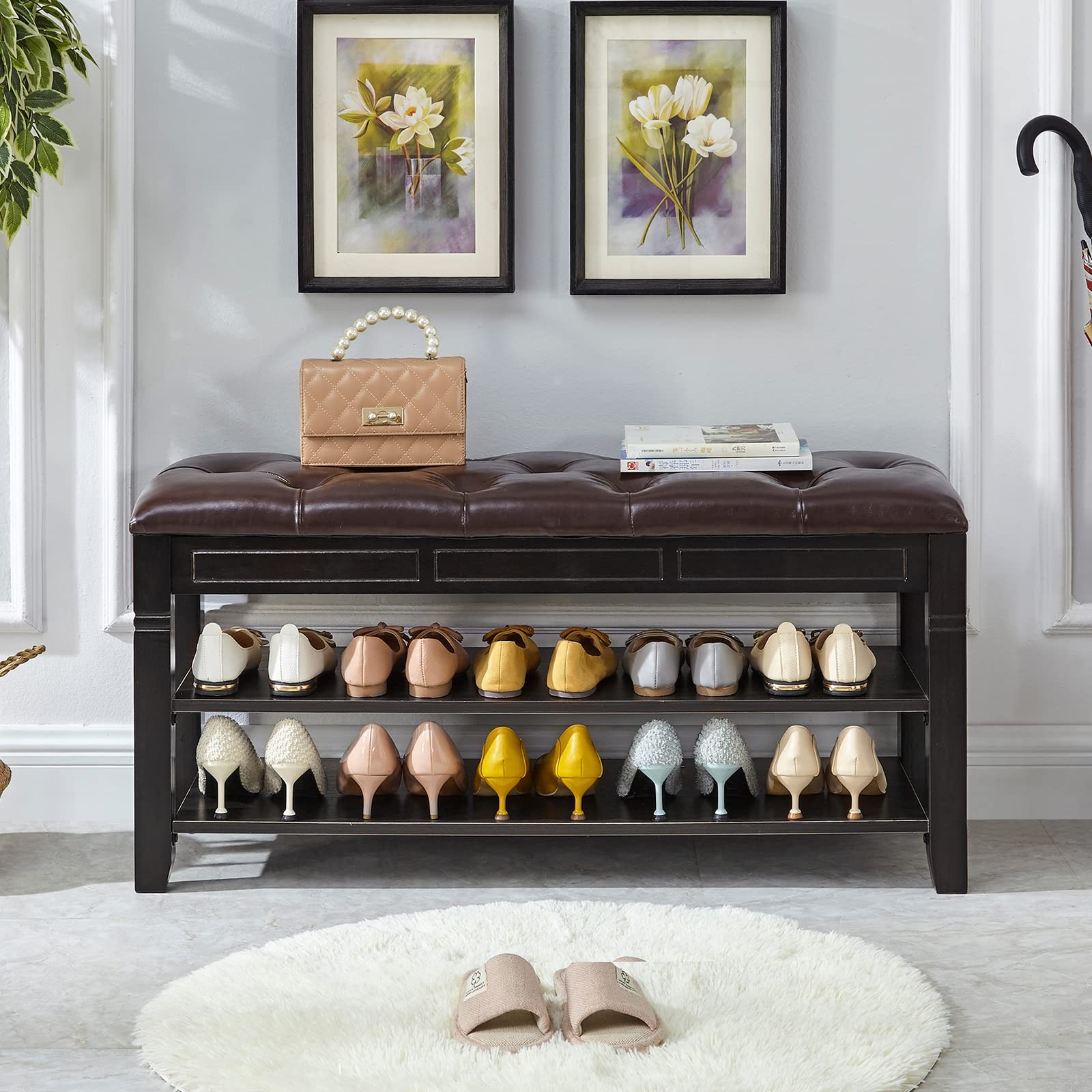 If your entrance area looks a little monotonous and shoe all over the place, this shoe bench will come in handy, create a tidy and welcoming entryway with this shoe storage bench. The LEILISI Shoe Storage Bench with cushioned seating is designed to offer the right blend of functionality and aesthetics that will keep your entryway clean and tidy. You can conveniently organize your footwear and use it as a comfortable bench to take your shoes on and off. HIGH QUALITY MATERIAL: This shoe bench is made from 100% solid rubberwood, Use the water-based coating paints, sturdy and durable, the max load capacity can up to 450 Lbs. CHEMICAL FIBER LEATHER: The upgraded model of environmentally pleasant cloth, distinct from PU leather-based, more wear-resistant and durable, like new even supposing used for a long time. ADEQUATE SPACE: Accommodate 10~12 pairs of footwear, flip storage design, anti-pinch buffer device, ample garage area to position some small gadgets (insoles, socks, shoes brush, shoe polish,etc.) EXQUISITE SHOE BENCH: Strong wooden bench isn't smooth to crack, feature simple and classical appearance design, can be use on bed room, living room, hallway, entryway, etc. EASY TO ASSEMBLY: Simply fasten the legs and board together in the order of installation, detailed instruction helps you to quick install the shoe rack in a few minutes.
