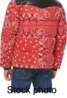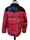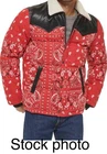 67% Polyester, 33% Cotton FUNCTIONALITY: Center front zipper closure with snap button overlay, two lower welt pockets, one interior safety pocket STYLISH FEATURES: Contrast faux leather yoke, sherpa lined collar, Levi's red tab logo at lower left seam WARMING FEATURES: The quilted paneling is filled with faux down insulation to trap in body heat