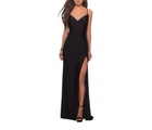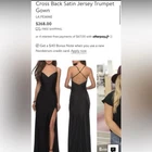 Made of a liquid shine satin like fabric, this formal dress from La Femme is sleek, sexy, and classy all at once. Hidden back-zip closure; clasps behind back for straps V-neck Sleeveless Dipped back with crisscrossing straps Floor-length trumpet skirt with a front slit and train Lined Good condition, no known flaws Size 8 (approx, on hanger) pit-pit 15” flat waist 14” length 63” Color: black Tags: classic, timeless, neutral, minimal, formal, prom, homecoming, black tie, wedding guest, special occasion
