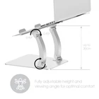 Perhaps you are the kind of person who desires perfection. Perhaps you long for an object that seamlessly integrates into your living space; with a kind of finish that allows your fingers to lightly brush over sleek, refined aluminium. Perhaps you are also the kind of person who desires performance. So you strive for superior, long-lasting build quality in a fully adjustable, ergonomic design. And if you are - Then are you also the kind of person who, above all else, desires protection? Protection of your device, and protection of yourself...? Then this - is the View Supreme Dual Pivot Adjustable Riser Stand for Laptops presented in sleek, refined aluminium. With ergonomically designed elevation providing adjustable height (up to 30cm) and viewing angle (0-90 degrees) through dual pivot rotation of your 10-17” laptop or MacBook and the ability to flat pack for easy transportation, the View Supreme Dual Pivot Adjustable Riser Stand for Laptops could be your ultimate object of desire. PREMIUM FINISH: Premium aluminium alloy stylishly compliments Apple computers and products such as Macs, iMacs, and MacBooks. A laptop stand for desk or table that is professional and minimalist, great office laptop accessories for work and home use ERGONOMIC DESIGN: Fully adjustable height up to 30cm and angle up to 90 degrees for comfortable viewing, promoting good posture and reducing strain on your eyes and neck. SUPERIOR, LONG-LASTING BUILD QUALITY: Strong Construction enables compatibility of most 10-17” Laptops with a superior 6KG weight bearing capacity. ANTI-SLIP RUBBER PADS: Rubber silicone pads help secure your laptop, and anti slip feet prevent slippage even on shiny surfaces. INCREASES COOLING AND AIRFLOW: Easy to set up, free standing and great for providing laptop fans with the space to breath and keep cool. The open design increases cooling and airflow around the laptop whilst working.