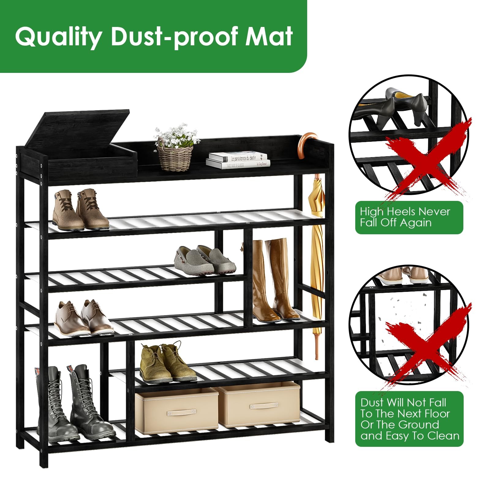 Organize your shoe collection in style with our Premium Bamboo Shoe Rack. Made from premium bamboo material, this shoe rack offers a perfect blend of functionality and aesthetics. The 6-tier design provides ample space to store all your shoes, while the dedicated boot racks ensure your favorite boots stay in excellent shape. Dust-Proof Pads: Each layer of the shoe rack is equipped with dust-proof pads, preventing shoes from falling into the gaps and keeping dust from settling on lower levels, ensuring cleanliness and tidiness. Durable Bamboo Construction: Crafted from high-quality bamboo material, this shoe rack offers exceptional durability and long-lasting performance, ensuring it withstands daily use. Ample Storage Space: With its 6-tier design, this shoe rack provides ample storage space for all your shoes, keeping them organized and easily accessible. Convenient Boot Rack: Equipped with 2 dedicated boot racks, this shoe organizer allows you to neatly store and display your favorite boots, keeping them in perfect condition. Handy Storage Box: The included storage box is perfect for storing various small items, such as shoe accessories, socks, or keys, keeping your entryway clutter-free. Practical Desktop: The shoe rack features a small desktop on top, offering a convenient space to place daily essentials like a wallet, phone, or decorations. Sturdy and Stable: This shoe rack is designed to provide stability and support, ensuring it remains steady even when fully loaded with shoes. The bamboo material adds to its sturdiness and longevity. Two Color Options: Choose between sleek black or stylish tan brown, allowing you to match the shoe rack with your existing decor or personal preference. 180 Days Warranty:We are committed to providing customers with quality products and services, if you have any questions can contact us, we will try our best to solve.