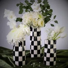 Large Checkered Vase, Modern Home Decor, Decorative 11" Tall, Product Details Material: Ceramic Color: Checkered Brand: Reimagine Discovery Product Dimensions: 3.75"L x 3.75"W x 11.25"H Shape: Oblong HAND PAINTED CERAMIC VASE: A traditional vase with a modern spin, our hand-painted black & white checkered vase will complement home decor and stand out across the rest of your room aesthetic. Our checkered vase is a tall cylinder vase with a squeezed look at the top that opens with a wide star-shaped mouth. Not only does this allow your vase to hold a large floral arrangement but it also helps fan your blooms and dried grasses beautifully. AESTHETIC HOME DECOR: Showcase timeless elegance that’s versatile enough to blend with decades of interior design trends. Display our checkered vases in your home office, bedroom or living room. Use them standalone depending on the size of your floral arrangement needs or pair in a set-of-3 for a gorgeous, explosive flower extravaganza. HOME DECOR GIFTS: Whether you’re shopping for yourself or looking for a unique gift for friends or family, these checkered vases will be sure to impress. The black & white color is universal enough to pair with a diverse range of botanical styles. Try dried grasses, silk flowers or treat yourself to a personal flower Friday! DESIGNED IN THE USA: Our team partners with exclusive ceramic manufacturers that have decades of experience making premium ceramic products. We bring unique goods to the market that are custom modeled by our team of RD Home USA expert designers. REIMAGINE DISCOVERY: In a world where basic home décor is abundant, we aim to elevate spaces with unique style featuring room décor that's aesthetic, modern, and trendy. Our exclusive collection of interior goods are statement pieces that will curate an environment you love.