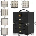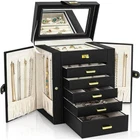 NEW! Jewelry Box Organizer Black Leather Jewelry Storage Holder Display Ring Necklace Earring Bracelet Holder with Mirror Back - Made of Engineered Wood, Faux Leather, Velvet - Large Capacity; with 6 versatile pull out drawers, this black jewelry box can store a lot of jewelry accessories, such as rings, earrings, necklaces, chains, bracelets, and so on. Soft pillows in the bottom drawer suit for storing watches. One deeper drawer is designed for sunglasses or large jewelries - Ideal Gift for her THANK YOU!