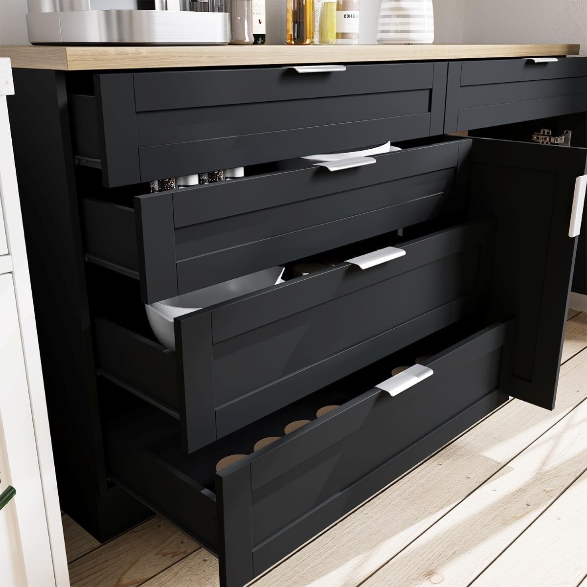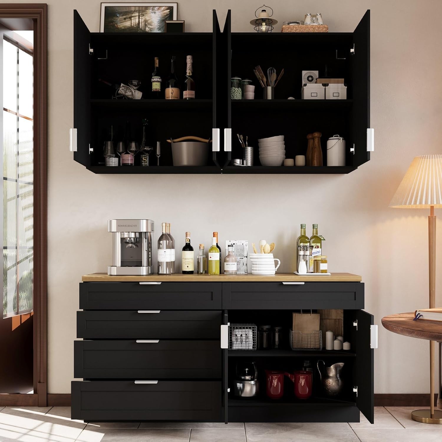 Product Description About this item Large Storage Capacity: This cupboard features 5 spacious drawers and 6 doors with 2 shelves behind each door for ample storage space. The well-organized interior with multiple levels ensures that cluttered items are neatly organized and easily accessible, maximizing storage capacity. It also keeps dust out, keeping your kitchen or dining area tidy and clutter-free. Sturdy and Durable Structure: This set of cabinets is made of high quality P2 Medium Density Fiberboard (MDF) material, which is not easy to corrode and deteriorate, and the overall cabinet structure is solid, and the plate has a strong load-bearing capacity that is not easy to be deformed and durable. Elegant and Functional Design: This cabinet set comes with smooth, silent-gliding drawer tracks, while the addition of metal handles on the doors and drawers is both attractive and easy to use. The sleek black finish with the slashed oak color complements any kitchen or dining room décor. Versatile and Multi-Scene Application: Ideal for a variety of environments, this cabinet set can be used as a kitchen pantry, restaurant cafeteria or coffee bar. The large drawers and cabinets allow you to place more items while protecting supplies from dusty finishes, and their split cabinet design allows for flexible placement to fully accommodate your space and needs. Easy to Assemble and Install: Comes with clear instructions and all necessary hardware for easy assembly. The user-friendly design ensures that you can quickly and easily install this versatile, high-capacity split cupboard. Kitchen Pantry Storage Cabinet Set with Wall Cupboard Extra Storage Space, Convenience and Beauty This split cupboard set combines both a wall-mounted cupboard and a free-standing dining sideboard for efficient use of space and strong storage capacity.Ideal for enhancing your home storage. Specifications: Material: P2 MDF Color: Black + Knife Chopped Oak Overall Dimensions: 13.4"D x 63"W x 33.5"H Handles Drawers Sturdy Hinged Connection Large Capacity Colour Black + Knife Chopped Oak Material P2 MDF Overall Dimensions 13.4"D x 63"W x 33.5"H Package Includes Cabinet Set with Wall Cupboard X 1, Instructions X 1, Anti-tip L Iron Sheet On Aug 15, 2025 at 01:10:36 PDT, seller added the following information: