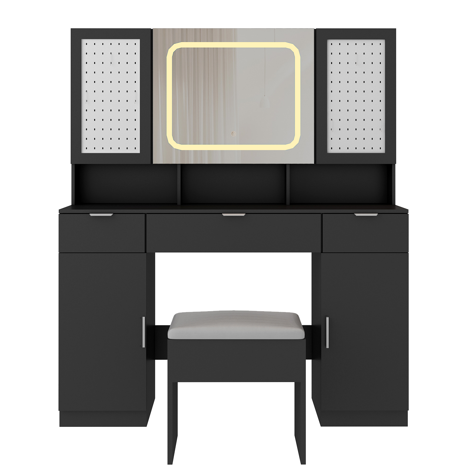 listing template Visit our store Sigh up for email Vanity Set Desk Drawers Large LED Lighted Mirror Power Outlet & DIY Pegboards Introductions: Transform your daily routine with this elegant and modern vanity table set. With a beautifully lit mirror that offers adjustable brightness and 3 lighting modes, this vanity creates the perfect setting for makeup application, skincare, or hairstyling. Storage shelves behind the mirror and two pegboards, together with 3 drawers and 2 cabinets, offer plenty of space to keep your beauty essentials organized. Combining modern aesthetics with practical design, this vanity set adds a luxurious touch to your bedroom or dressing area, creating a personal space where you can feel pampered and inspired every day. Features: 1. Ample Storage Capacity: This vanity table is designed to maximize your storage with 3 storage shelvess behind the mirror and pegboards, 3 open shelves on tabletop, 3 drawers and 2 cabinets, keeping all your makeup, skincare, and accessories neatly organized and easily accessible. 2. DIY Pegboards: This vanity set comes with 2 pegboards and 5 hooks, allowing you to hang everything from jewelry to headphones, or containers to hold makeup brushes and stationery. The pegboards allow for versatile and creative arrangements, so you can easily personalize your vanity setup. 3. 3 Lighting Modes with Adjustable Brightness: The mirror features built-in LED light that offers 3 color lighting modes (warm, natural, cool) and adjustable brightness, ensuring the perfect lighting for any time of day or makeup look. 4. Convenient Charging Station with USB Ports: The built-in power strip includes 2 standard plug sockets and 2 USB ports, making it easy to charge your devices or use your hair dryer and curling iron while seated at your vanity. 5. Luxurious Comfort with Cushioned Stool: The plush cushioned stool provides comfort during long makeup sessions, and its compact design fits perfectly under the table to maximize space when not in use. Our vanity set brings a stylish modern look to your home, making it a perfect gift for yourself or a loved one. Specifications: 1. Materials: Particleboard, LED 3-color adjustable glass mirror, Iron pegboard doors 2. Dimensions: (47.2 x 15.7 x 55.1) in / (120 x 40 x 140) cm Package Includes: 1 x Vanity Table 1 x Cushioned Stool 1 x Set of Assembly Hardware You might like this more>> 6-Tier Bamboo Bookshelf Adjustable Storage Shelf Rack $49.99 Professional Cello 4/4 Full Size BassWood Set with Bag $148.99 Stainless Steel 4 Tier Steamer Cooker Steam Pot Kitchen Food $39.29 110 LB x 0.1oz All-In-One Digital Postal Shipping Scale 50kg $22.79 2Pack 10000LM LED Zoomable Flashlight Torch Lamp Light $9.99 Mini Exercise Bike Desk Pedal Bicycle $35.14 Shipping Policy 1. Ship worldwide from New Jersey by reliable shipping companies -- USPS, UPS, FEDEX, DHL, etc., and only to VERIFIED PAYPAL ADDRESS. Transport Delivery ETA. Package handling only takes 1 business day at our warehouse, so please make sure entering correct payment and shipping information before checking out. Once your payment is completed, we are not going to accept any more changes to your order. 2. International Buyers – Please Note: a. Import duties, taxes and charges are not included in the item price or shipping charges. These charges are the buyer's responsibility. b. Please check with your country's customs office to determine what these additional costs will be prior to bidding/buying. 3. Please check your shipping address carefully before checkout, it can't be changed if order completed. 4. Orders placed on weekend will be shipped within 2 days.Notification of shipment with tracking number will be sent to buyers. 5. Standard shipping: 2-7 business days Expedited Shipping: 2-3 business days One-day Shipping: 1 business day International shipping: Varies 6.Ship within 1 business day once payment completed. Notification of shipment with tracking No. will be sent to buyer. 7.We offer discounts for combine shipping. Please contact us first if you need combine shipping, and an invoice with discount will be sent to you. 8.Please allow 5 business days for delivery to US destinations on any eBay orders and 14 business days for delivery to any International destinations. We highly recommend our buyer choose priority/expess mail for international delivery which is much more stable. Return Policies 1. Refunds given only if item DOA and cannot be replaced via PAYPAL . If so, Please contact us with 5 days since you receive the item and and return to us within 30 days from the delivery date for exchange or refund. 2. If you need return, please contact our customer service representative, let us know the detailed problem and send us some pictures for confirmation. Payment Payment should be sent within 8(EIGHT) days of auction closing. Feedback If you are dissatisfied for any reason, please do not be quick to leave negative/neutral feedback. We work hard to make sure EVERY CUSTOMER 100% SATISFIED and resolve any problem for you. Work Time Work Time: Monday to Saturday About Us | Newsletter| Feedback| Contact Us Copyright © 2021 Yallstock. All rights reserved. 无标题文档 Vanity Set Desk Drawers Large LED Lighted Mirror Power Outlet & DIY Pegboards Introductions: Transform your daily routine with this elegant and modern vanity table set. With a beautifully lit mirror that offers adjustable brightness and 3 lighting modes, this vanity creates the perfect setting for makeup application, skincare, or hairstyling. Storage shelves behind the mirror and two pegboards, together with 3 drawers and 2 cabinets, offer plenty of space to keep your beauty essentials organized. Combining modern aesthetics with practical design, this vanity set adds a luxurious touch to your bedroom or dressing area, creating a personal space where you can feel pampered and inspired every day. Features: 1. Ample Storage Capacity: This vanity table is designed to maximize your storage with 3 stor