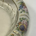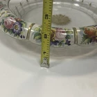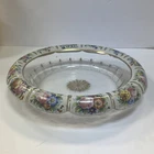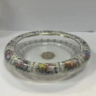 Large Vintage Glass Shallow TRINKET / jewelry DISH w/Gold Detail white Rim w/ Flowers Pink Blue yellow Approximately 9 3/4 “wide Please see photos and measurements. There is a small chip on the outside edge as shown in photos. There are scratches inside due to use. Zoom in to see. Rim edge is white with beautifully detailed flowers. Would be a great dish to store your necklaces, earrings, perfume bottles, or bathroom item. We don’t accept returns, so please take your time deciding on your purchase. For your support of this small shop!