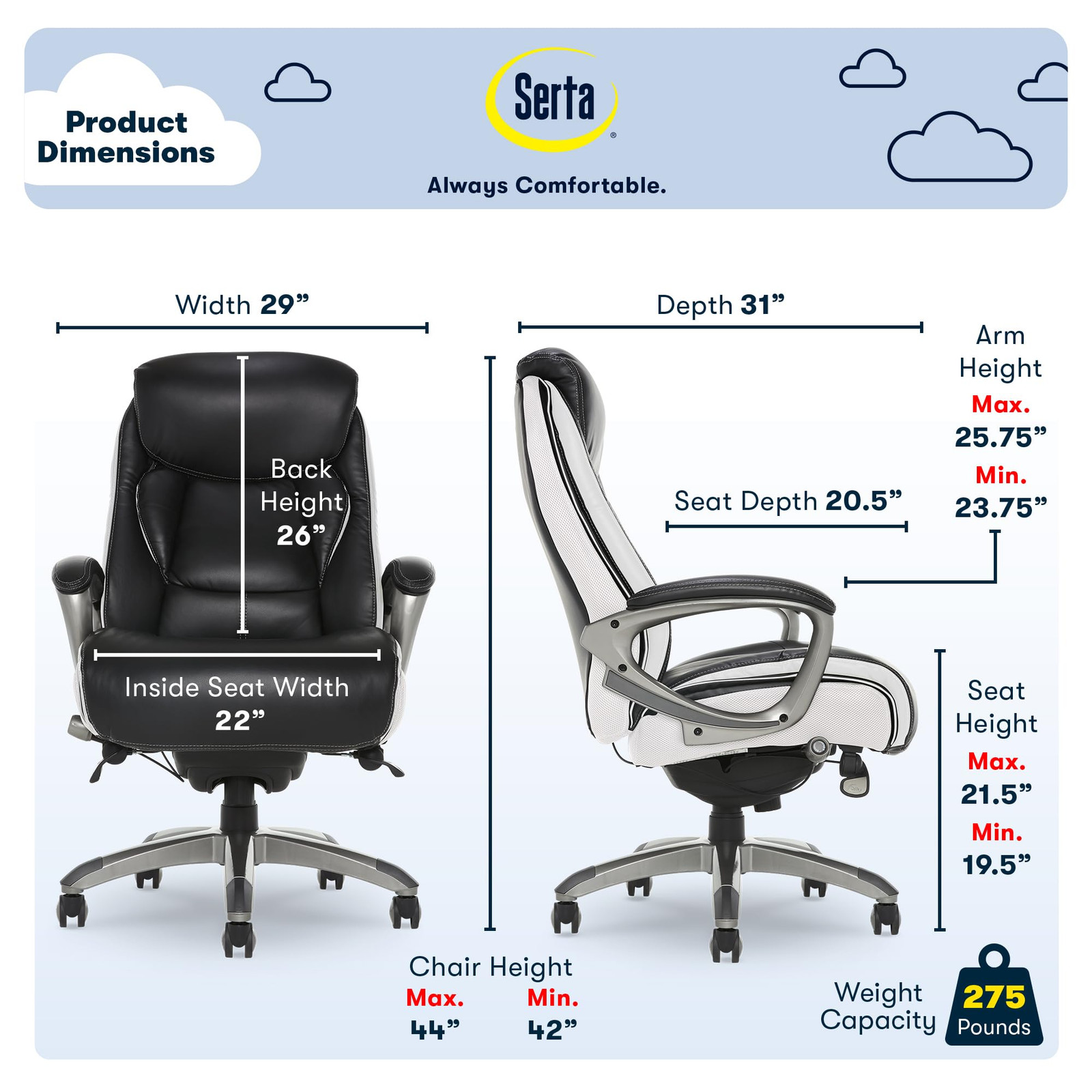 Find a reason to relax during your workday with the Executive Office Chair from , a brand known for quality and comfort. This ergonomic desk chair has layered body pillows and a pillowed headrest to provide ease while seated for long periods of time. The hand-sculpted arms and smooth bonded leather upholstery have a sleek, professional look that stands out in any work environment. Fully adjustable, this executive office chair allows the user to customize the height and lumbar zone for optimal comfort. This desk chair has a five-layer cushioning system for all day comfort and support. TWO-TONE MODERN EXECUTIVE: A modern silhouette with a high-back design, sculpted arms, and contrast double-stitching is upholstered in breathable mesh and smooth bonded leather. Brings a sophisticated look in a stylish two-tone black and white colorway. SMARTLAYERS CUSHION SYSTEM: The 5-layer foam seat cushion covers individually wrapped ComfortCoils for enhanced comfort that feels plush, reduces sagging, and ensures the cushion maintains its shape over time. ADJUSTABLE LUMBAR SUPPORT: Contoured backrest with an adjustable lumbar lets you shape the curve of your spine to maintain good posture. The padded headrest, body pillows, and armrests offer ergonomic support for your neck, back, and shoulders. FOAM & ENDORSEMENT: All chairs use quality non-recycled and non-toxic foams, exceed minimum industry testing standards, and are endorsed by the American Chiropractors Association. DURABLE BUILD: Heavy duty nylon swivel base sits on 360º silent dual caster wheels and supports up to 275 lbs. Seat-side fingertip controls let you adjust height and set tilt-lock with an adjustable knob that controls the tilt tension.