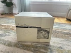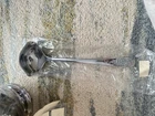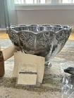 This is a vintage Lenox Grape Weave Metal Serveware set from 2003-2007, featuring an eleven-piece round set for all occasions. It includes a punch bowl, eight glasses, ladle, metal bottle holder, and has a grape weave pattern. The set is silver and clear in color with a glossy finish, designed in a Mid-Century Modern style. The pieces are hand wash only and made of glass and metal alloy. This discontinued set is a decorative addition for adult gatherings.