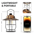 Lepro Vintage LED Camping Lantern Rechargeable, Power Bank, Christmas Decorations, Retro Style, Classic Railroad Lantern with Dimmable Control, Portable Hanging Tent Light for Camping, Power Outages Product Details Light Source Type: Light Emitting Diode (LED) Brand: Lepro Color: Bronze Power Source: USB Rechargeable Material: Acrylonitrile Butadiene Styrene (ABS) Product Dimensions : 6.3 x 6.3 x 6.89 inches; 10.58 ounces Item model number : PR330039 Batteries : 1 Lithium Ion batteries required. (included) Date First Available : October 26, 2022 Manufacturer : Lepro Country of Origin : China Customer Reviews: 4.6 4.6 out of 5 stars 148 ratings Product Dimensions: 6.3"L x 6.3"W x 6.89"H Battery Description: Lithium-Ion Brightness: 450 Lumen Item Weight: 0.3 Kilograms Mounting Type: Tabletop Mount Water Resistance Level: Waterproof Battery Life: 26.75 Hours Bulb Base: GU10 Number of Batteries: 1 Lithium Ion batteries required. (included) Specification Met: IPX3 Voltage: 5 Wattage: 6 watts Manufacturer: Lepro Part Number: PR330039 Item Weight: 10.6 ounces Country of Origin: China Item model number: PR330039 Batteries: 1 Lithium Ion batteries required. (included) Item Package Quantity: 1 Included Components: Batteries included Batteries Included?: Yes Batteries Required?: Yes Date First Available: October 26, 2022 Dimmable & Pleasant Bright. Rechargeable lantern comes with a dimming function and has 3 lighting modes (white light, warm light and warm white light). Just turn the top switch then smoothly dials from low light to high. The output ranging from 15LM to 450LM allows you to completely brighten your surroundings or simply set the mood. Long Battery Life & Emergency Charging. This LED camping lantern built-in rechargeable battery, which can be used for 50 hours on low or 3.5 hours on high after 4 hours of charging via a USB-C cable (included). And there are four LEDs that conveniently let you know how much charge left and charge in time. Lantern can also serve as a power bank for cell phones or mobile devices in emergency. Retro & Portable Design. 5.5*5.5*7.4 in, weighs only 0.88 pounds, lightweight and portable, you can easily carry the LED lantern to anywhere, not only on the tabletop, but also hanging on shepherd hooks, tents or branches. Vintage shape and texture resembling a traditional barn lantern, it is a nice companion for camping and outdoor dining or a peaceful evening stroll. Sturdy & Water Resistant. The outdoor Lantern is made from metal construction and seeded glass globe, high-quality iron protects the interior lighting cover, durable in nature and still function flawlessly from the backyard to the backcountry. Wide Application. This LED lantern is the perfect addition to any situation - can be used in garden, camping tent, emergency lighting, home power outage, Christmas party decoration, and enhances ambience by offering a soft, warm, unobtrusive glow. It is an ideal holiday gift for your family or friends.
