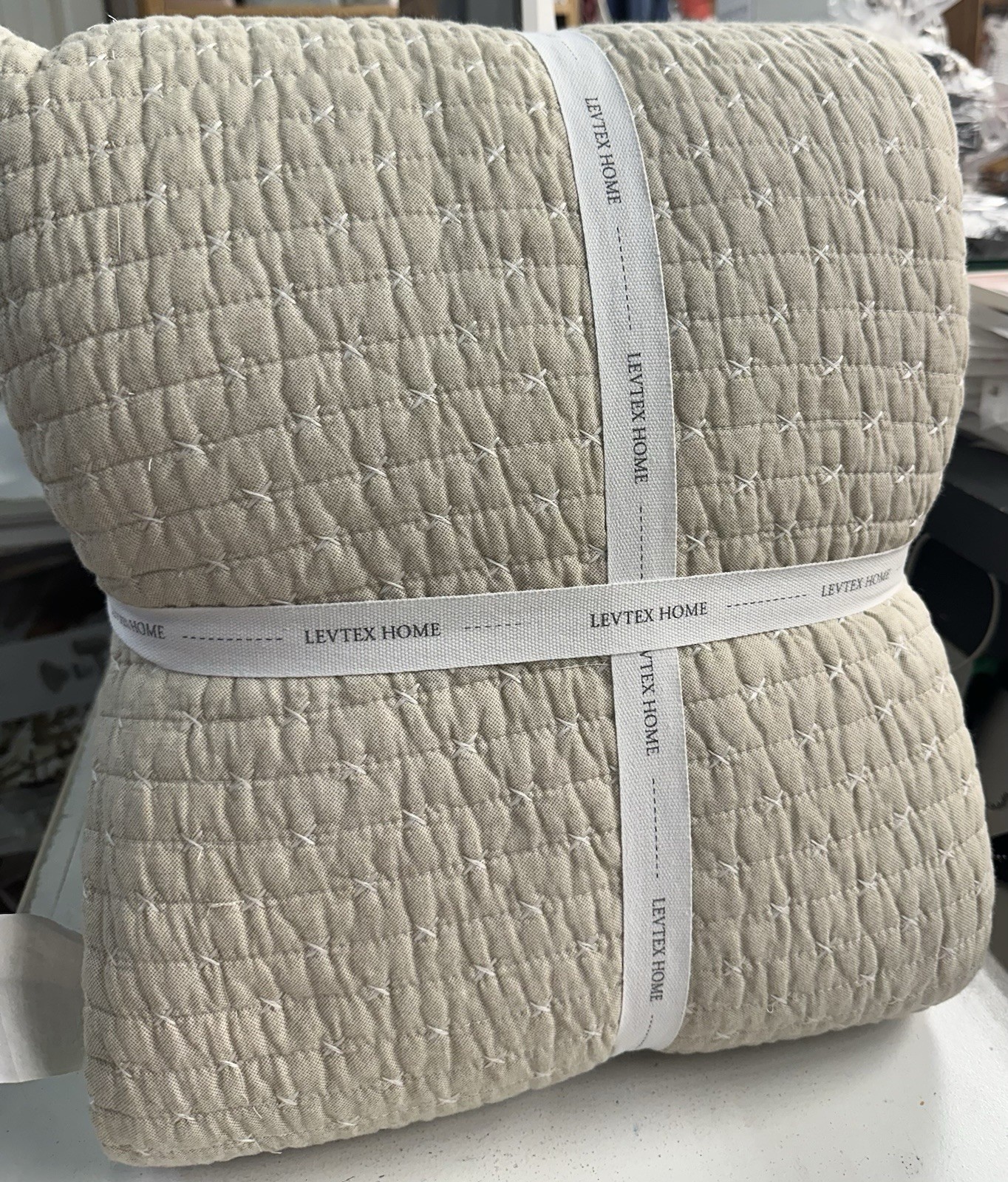 The LevTex Home Cross Stitch Taupe Bedspread Set is a modern and stylish addition to any bedroom, featuring a solid beige color with a quilted design. Made of cotton with 100% blended fiber batting, this Queen-sized set includes a bedspread and pillow shams, perfect for teens and adults alike. Easy to care for with machine wash instructions, this rectangular bedspread set adds a touch of elegance to your room with its standard certification and unique stitch character.