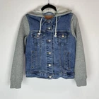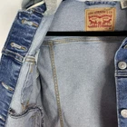 This Levi's Trucker Jacket is a must-have for any fashion-forward woman. The jacket is made of high-quality cotton denim and features a button closure with a hood and pockets. The jacket comes in a medium size and has a solid blue color with accents of buttons and logos. The jacket is perfect for any occasion, whether it's for travel or casual wear. It has a retro and classic style that is suitable for any theme, including cars, biker, motorcycle, American, grunge, cowboy, and preppy. The jacket is machine washable and easy to maintain. Get this Levi's Trucker Jacket today and add a touch of style to your wardrobe! This jacket looks to run small. Please see measurements to help with the fit. Measurements: Pit to Pit: 17 inches Length of Jacket: 21 Inches Size: M - but looks to run small Washed and Dried for you!