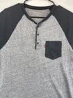 This Levi's T-Shirt for men features a solid pattern with a gray and black Henley neckline. The short sleeve T-shirt is made of comfortable cotton knit fabric that is easy to care for and suitable for all seasons. It has a regular fit with a button accent and is available in size See photos for measurements. The T-shirt is perfect for outdoor and classic themes and is a must-have for any wardrobe. Very good preowned condition. The tag has been worn away and as such, PLEASE SEE ALL PHOTOS FOR MEASUREMENTS. For clothing specifically, see photos for all measurements and/or any issues if applicable. All clothing has been washed and comes from a smoke free environment. I am available for questions. I accept or negotiate reasonable offers. Have an amazing day. Thank you.