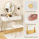 Makeup Vanity Desk with Lighted Mirror, Dressing Table and Chair Set with 3-Color Lighting, Acrylic Makeup Organizer & 2 Large Drawers, Modern Vanity Set for Bedroom, Studio Product Description About this item 3-color Lighted Mirror for Makeup: The vanity table has a LED lighted mirror for clear reflection. Thanks to the smart touch control, it is convenient to adjust colors (warm yellow/warm white/cool white) or brightness according to your different needs. Ample & Abundant Storage Space: The makeup table has a spacious tabletop and 16-grid acrylic makeup organizer to keep your items organized and within reach. Plus, there are 2 pull-out drawers to store your jewelry, cosmetics, hair straighteners, and other items. 2-in-1 Design with Detachable Top: The top of this dressing table is removable for different uses. It can be used as a vanity table for you to makeup and dress, or a computer desk to work, study, and more. Cushioned Stool for More Comfort: To bring you ultimate comfort, the makeup vanity set comes with a soft cushioned stool, making your make-up time enjoyable and relaxing. You will feel comfortable even after sitting for a long period of time. Reliable and Stable Construction: With strong metal legs and adjustable foot pads, the table and chair stay steady and are not easy to wobble. More importantly, the anti-toppling device helps to secure the dressing table to the wall for enhanced safety and sturdiness. Description: Our vanity set is an essential addition to your bedroom!!! The vanity table set has an LED lighted mirror with 3 colors, allowing you to enjoy your beauty at any time of the day. Meanwhile, you can long press the touch switch to change the brightness. When not in use, you can detach the mirror and use it as a writing desk. Moreover, there is a matched stool for additional comfort. The dressing table is equipped with 2 drawers, 1 acrylic box, 1 wide tabletop to accommodate a lot of things. Additionally, the table and chair feature solid metal legs and adjustable foot pads for excellent sturdiness and steadiness. Plus, there is an anti-toppling kit to avoid tipping over. Features: Designed with a detachable top for dual use: vanity table or computer desk Easy to make up with clear mirror with lights of 3 colors and adjustable brightness Long press to adjust brightness through the touch control 2 drawers and 1 acrylic box for ample storage space Anti-toppling device for higher safety and stability Comfy padded seat cushion for coziness Handy drawer knob to open the drawer Non-slip foot pads for added stability and floor protection Reinforced metal structure for great strength Safe & sturdy design for long-term use Specifications: Color: White + Gold Material: MDF, Metal, Glass Product Dimensions of Table: 31.5" x 16" x 54" (L x W x H) Product Dimensions of Stool: 16" x 13.5" x 17.5" (L x W x H) Mirror Dimensions: 21" x 18" (L x W) Drawer Dimensions: 13.5" x 11" x 3"(L x W x H) Makeup Storage Box Dimensions: 8.5" x 5" x 3" (L x W x H) Tabletop Weight Capacity: 110 lbs Stool Weight Capacity: 330 lbs Net Weight: 48.5 lbs Package Includes: 1 x Vanity Table 1 x Stool 1 x Acrylic Makeup Organizer 1 x 12V 1A Power Adapter 1 x User Guide