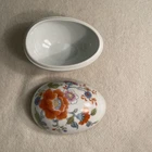 This Limoges France Porcelain Egg Shaped Trinket Box features a beautiful hand-painted floral design, making it a charming decorative piece for all occasions. The oval-shaped box is crafted from high-quality porcelain with a glossy finish, showcasing intricate French style. Measuring 4.5 inches in length, 3 inches in height, and 3 inches in width, this original 1980s piece from France is a unique collectible item that weighs 6.5 ounces. Excellent condition. No chips or cracks.