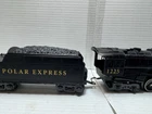 Lionel o gauge 2-8-4 steam locomotive. Rail name polar express. No.1225. in good condition although please see pictures. The front wheel truck is missing peace on side does not affect it’s performance I’ve tested. It works fine. Also missing its Bell and has minor scratch here and there. Please see pictures for details. Runs forward in reverse, smooth and quiet. If you any questions, please feel free to message me. Thank you and have a good day.