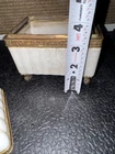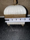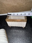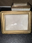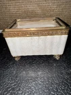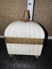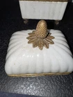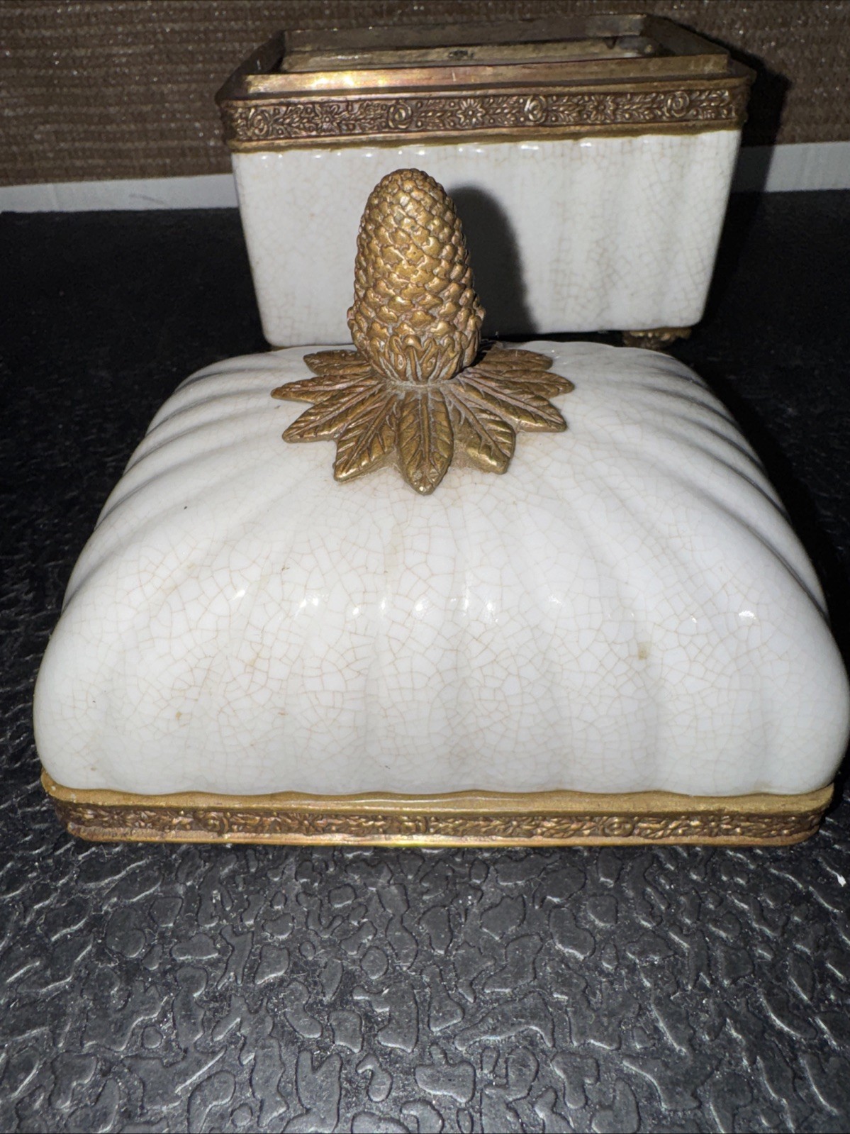 The Lizbeth Trinket Jewelry Box is a small rectangular box with a glossy porcelain crackle finish and brass touch design. The beige color and French style make it suitable for any room, particularly the bedroom. This vintage piece from late 80s/ Early 90s originating from China, features a pinecone design and comes boxed, making it a perfect collectible decorative item for adults' jewelry storage needs.