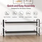 Still looking for your shoes anywhere? Wanna store all kinds of shoes at the same time? Our shoe stand can solve all your question! Easily Store 18 Pairs, Support Your Style: Shoe rack for closet dimension is 42.5”L x 11.4”D x 18.7”H, long shoe rack can hold up 18 pairs of shoes in total plus bottom space, such as men's sneakers, ankle boots, stylish heels, flip flops, sandals, kids shoes, etc, let's face it, most of us have more than 1 pair; Higher Tier Shelves, Fits High Boots: Each shelf height is 8",long shoe rack designed for high-heeled ankle boots or size 13 men's running shoes, each wider expandable shelf can store about 5-6 pairs men's or women's shoes; Stacking for More Space, Less Clutter: 2 sets and more can be stacked vertically to get a complete 4-tier shoe rack to hold about 30 pairs, removable shelves to fit knee high boots, stackable shoe rack help you expand floor space to store family member's shoes, shoe racks for bedroom closet declutter your floor away from messy; Say Hello to Steel Frame and Oxford Fabric: Invite a little bit of steel into your home with this sturdy closet shoe storage; showcasing the simple, clean design of powdered metal, this floor shoe rack will match greatly into any abode, and can wash the fabric with machine; Assemble in Minutes: you'll assemble the shoe holder in 5 minutes if you follow the detailed instructions in the package, the shoe rack is a solution to keep your doorway, wardrobe, dormitory, garage, living room, mudroom tidy and clean, you can also place short shoe rack at your attic, closet top shelves, basement, kitchen, pantry, etc.