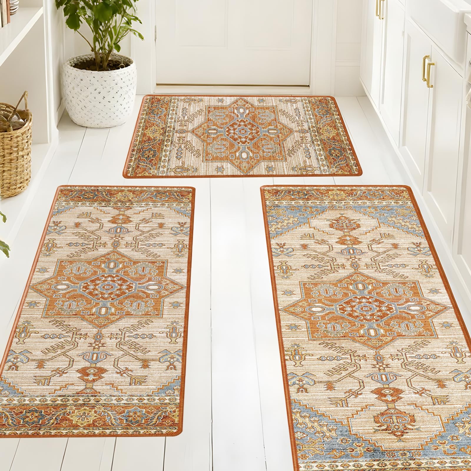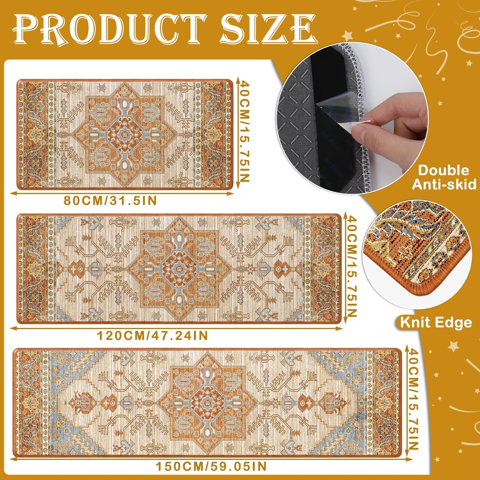 Material: Made from high-quality, long-lasting fibers; designed to withstand daily wear and tear; perfect for high-traffic areas in your home Material: Made from high-quality, long-lasting fibers; designed to withstand daily wear and tear; perfect for high-traffic areas in your home Stylish Aesthetic: Boho-inspired design adds a touch of farmhouse charm; complements various home decor styles; enhances the overall look of your kitchen or hallway Non-Slip Backing: Features a reliable non-slip backing; ensures safety and stability on various floor surfaces; ideal for kitchens, entryways, and laundry rooms Washable Design: Easy to clean and maintain; machine washable for hassle-free upkeep; keeps your mats looking fresh and vibrant over time Versatile Sizes: Comes in three convenient sizes: 16 X 28 In + 16 X 47 In + 16 x 59 In; perfect for layering or using individually; fits seamlessly in any space