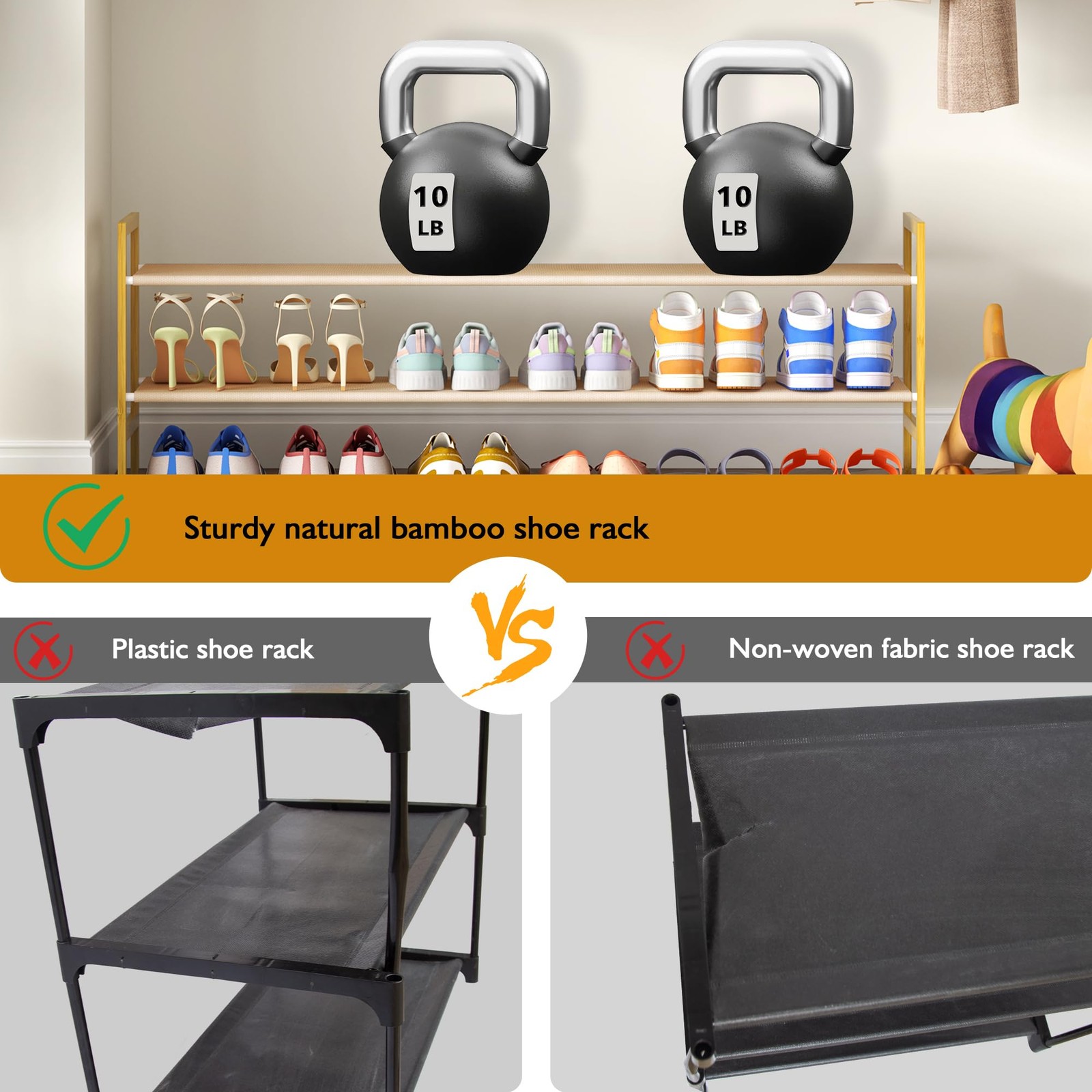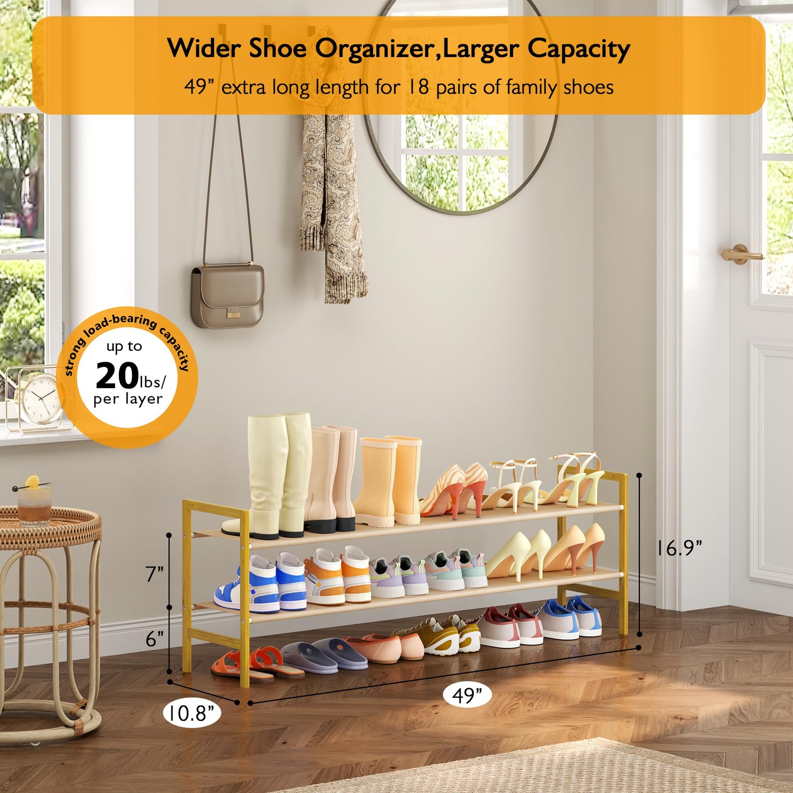 Long Shoe Rack for Closet Floor,2 Tier Wide Shoes Shelf Organizer,15-18 Pairs Bamboo Low Closet Shoe Stand Holders,Modern Sturdy Shoe Storage Rack for Entryway,49” x 11” x 17” 【Extra Long Shoe Rack】- The wide shoe rack organizer can store up to 15-20 pairs of shoes.The extra bottom layer is 6” high for hold slippers, flats, sneakers;Middle 7” high for high heels, ankle boots, etc.,and the upper layer for high boots, bags and everything else. Each wide shelf can store about 5-6 pairs men's , women's or kids shoes and keeping at a glance. 【Bamboo Floor Shoe Rack for Closet】- Size:49”L x 10.8”W x 16.9”H.The long and low two tier shoes shelf is suitable for placing in the closet, cloakroom or wardrobe,make good use of the bottom space of your closet floor.This natural wood shoe rack perfectly fits a variety of wardrobe, closets style. 【Sturdy Wooden Shoe Stand】- The 2-tier closet shoe organizer made of thickened metal tube with power coated,bamboo frame with varnish.Each layer can hold up to 20 LB without rocking.Come with 600D thickest polyester fabric,wear-resistant and stain-resistant,removable and washable. 【Simple Assemble in Minutes】- The long modern shoe shelf comes with numbered parts and detailed instructions, simple structure design allow you install very easy but still super sturdy.The entryway shoe organizer is a ideal storage solution for narrow or low-rise space, such as entryway,entrance, hallway, porch,closets, dorms,garages, doorway,etc. 【Elegant Home Decor】- Natural bamboo with brown dust oxford cloth and white metal pipe, simple and elegant design match perfectly into any abode. The floor standing shoe rack a solution to keep your bedroom, living room, mudroom,pantry and attic tidy and clean.