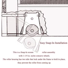 Commonly used to replace gliding patio door insect screen bottom roller assembly for Andersen 200 Series Perma-Shield Gliding, 200 Series Narroline Gliding, 400 Series Frenchwood Hinged, 400 Series Frenchwood Gliding and A-Series Gliding Patio Doors. Compatible with gliding insect screens manufactured from 1991 to present. Works with upper screen rollers part #1997063. Edge adjustment arm allows for easy and quick adjustments with a flat head screwdriver. No tools required to install, the roller housing has two tabs that lock under the frame to hold in place. 2 pack of lower screen rollers included, we recommend replacing both rollers at the same time.