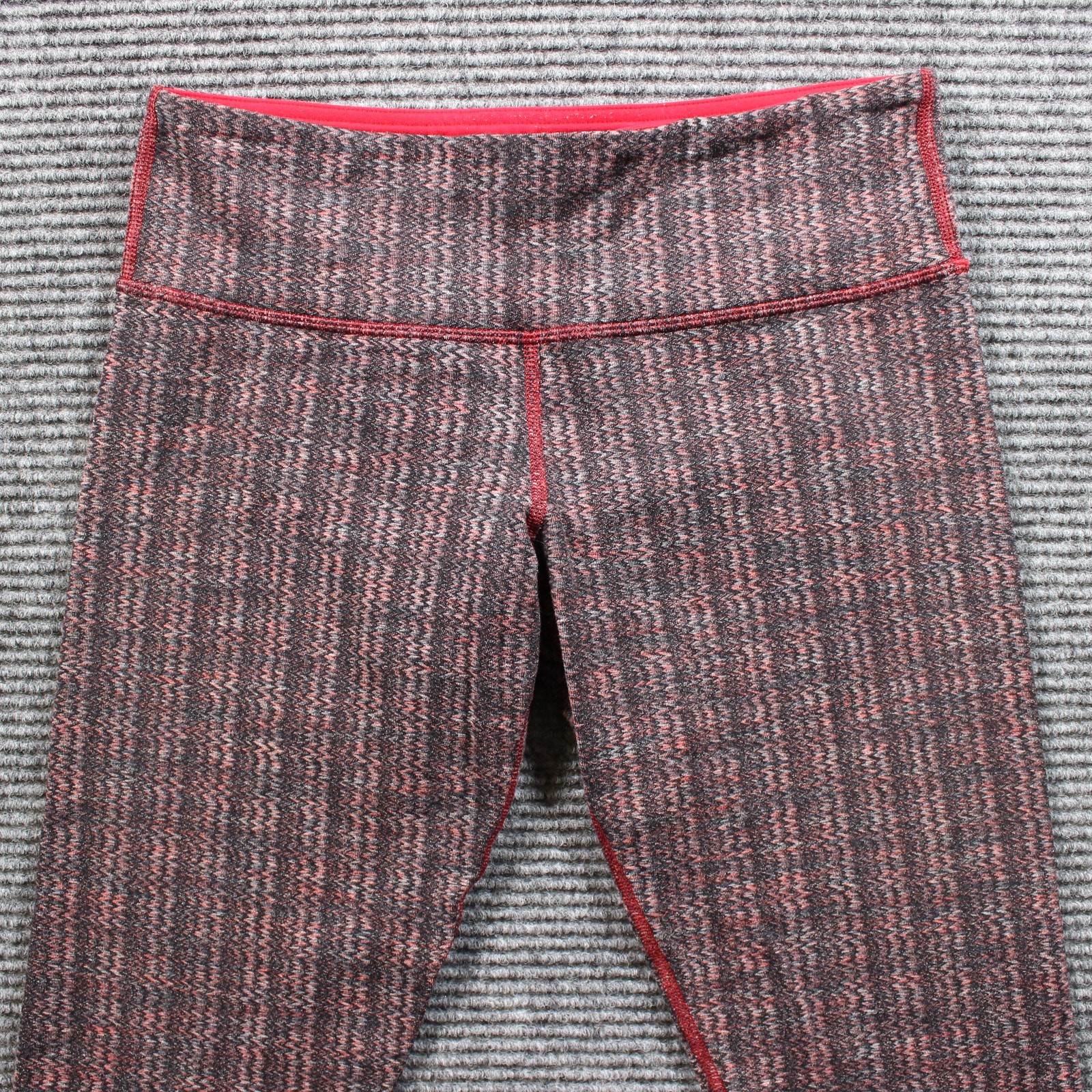 Lululemon Athletica women’s high-rise crop leggings in a red, black and gray space-dye pattern with contrast red seams. Soft, stretchy nylon/Lycra fabric keeps its shape and moves with you through yoga, gym sessions or everyday wear. Wide waistband offers a flattering, comfortable fit and cropped length hits above the ankle. Color may vary slightly from photos due to lighting and monitor settings. Details: Brand/Model: Lululemon Athletica leggings Style: Women’s high-rise crop/ankle leggings, wide waistband Color/Wash: red/black/gray space-dye print with red stitching Size: Women’s size 8 Fabric: 85% nylon, 15% Lycra spandex Condition: Good pre-owned; light overall wear, no holes or major stains noted Key Note: Cozy printed crop—great for studio workouts or casual athleisure outfits